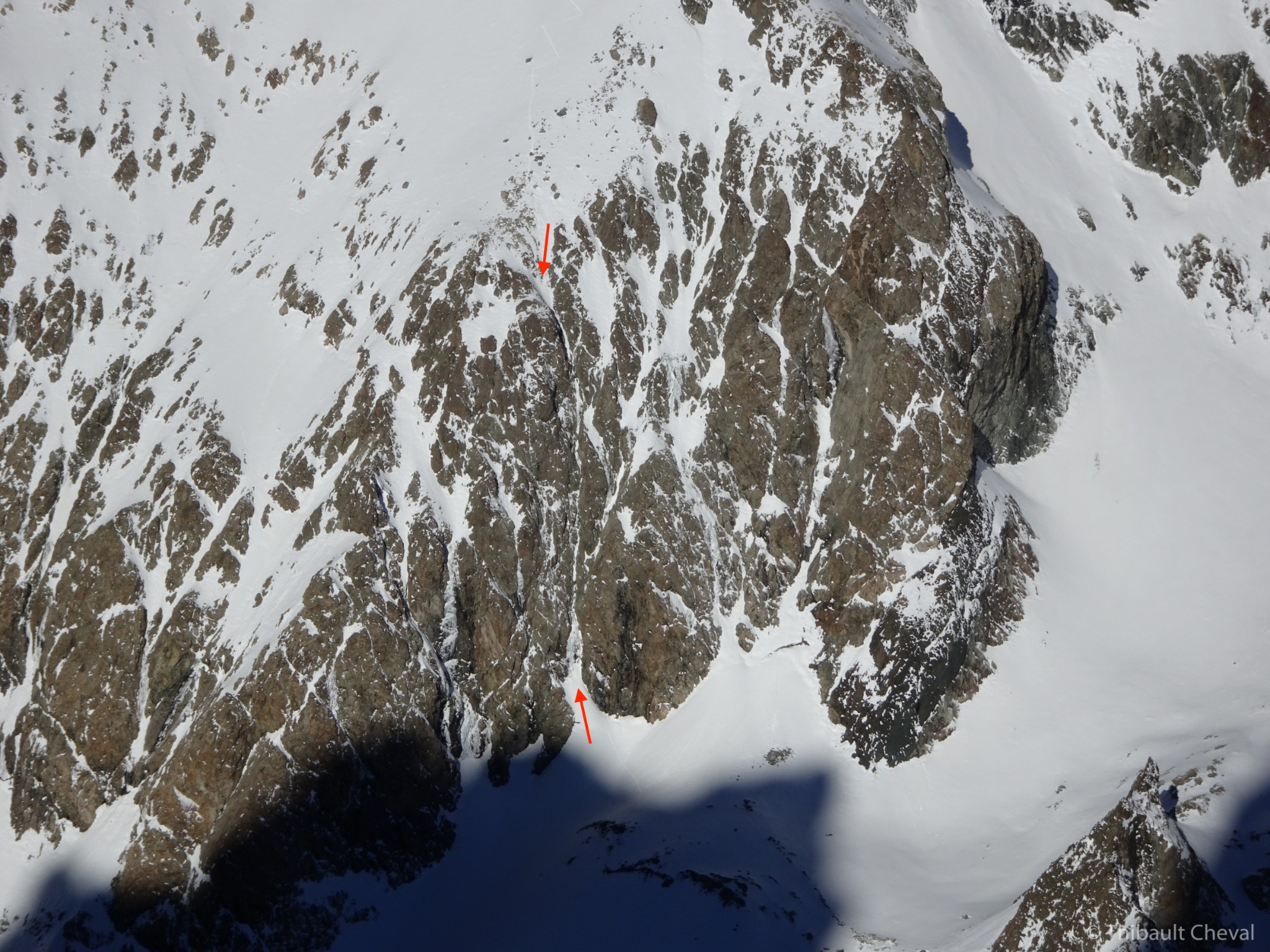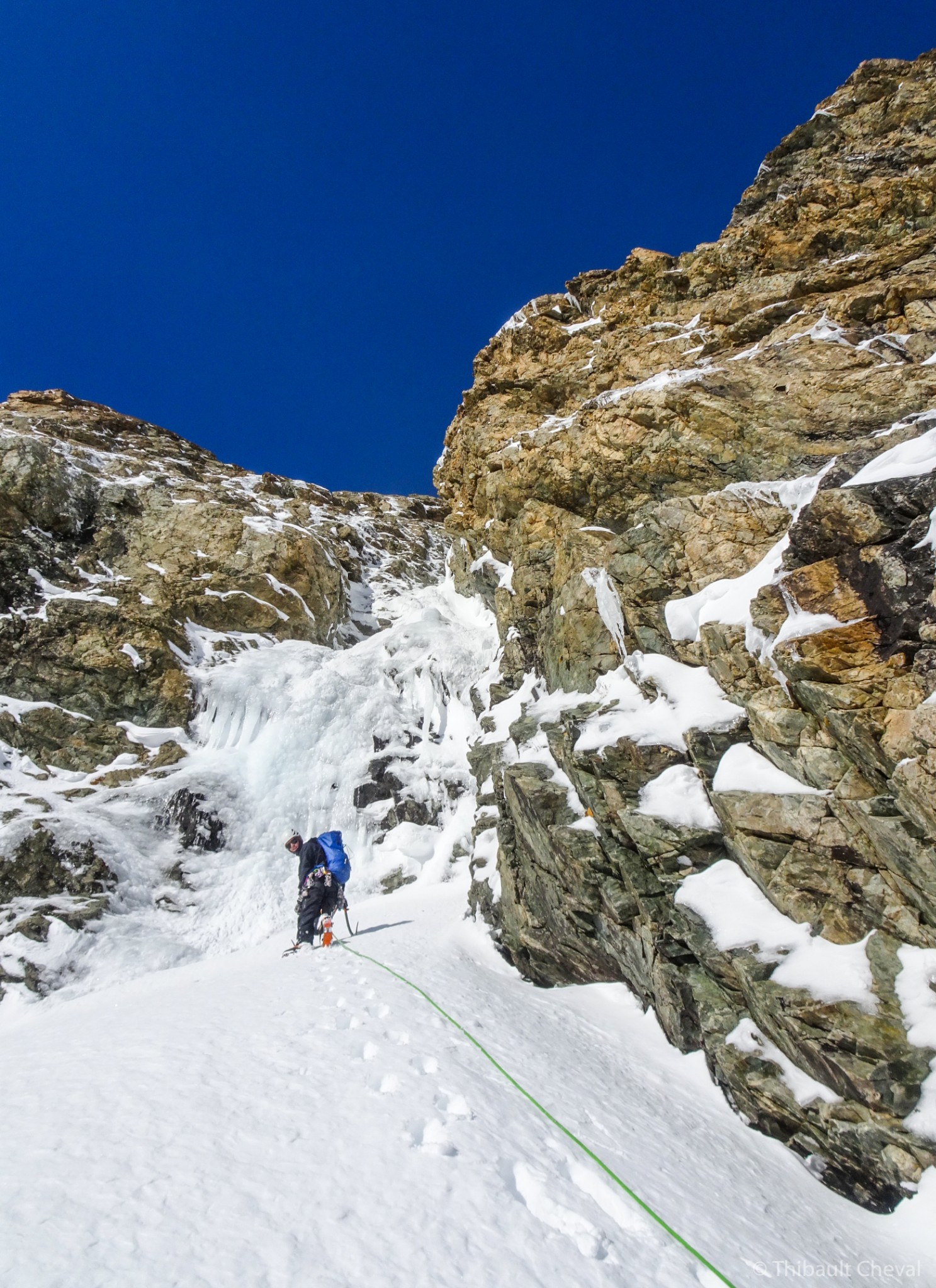 La goulotte s'attaque par une courte mais raide section en glace (4 sur une petite dizaine de mètres), on remonte ensuite la goulotte dont le cheminement est évident.
