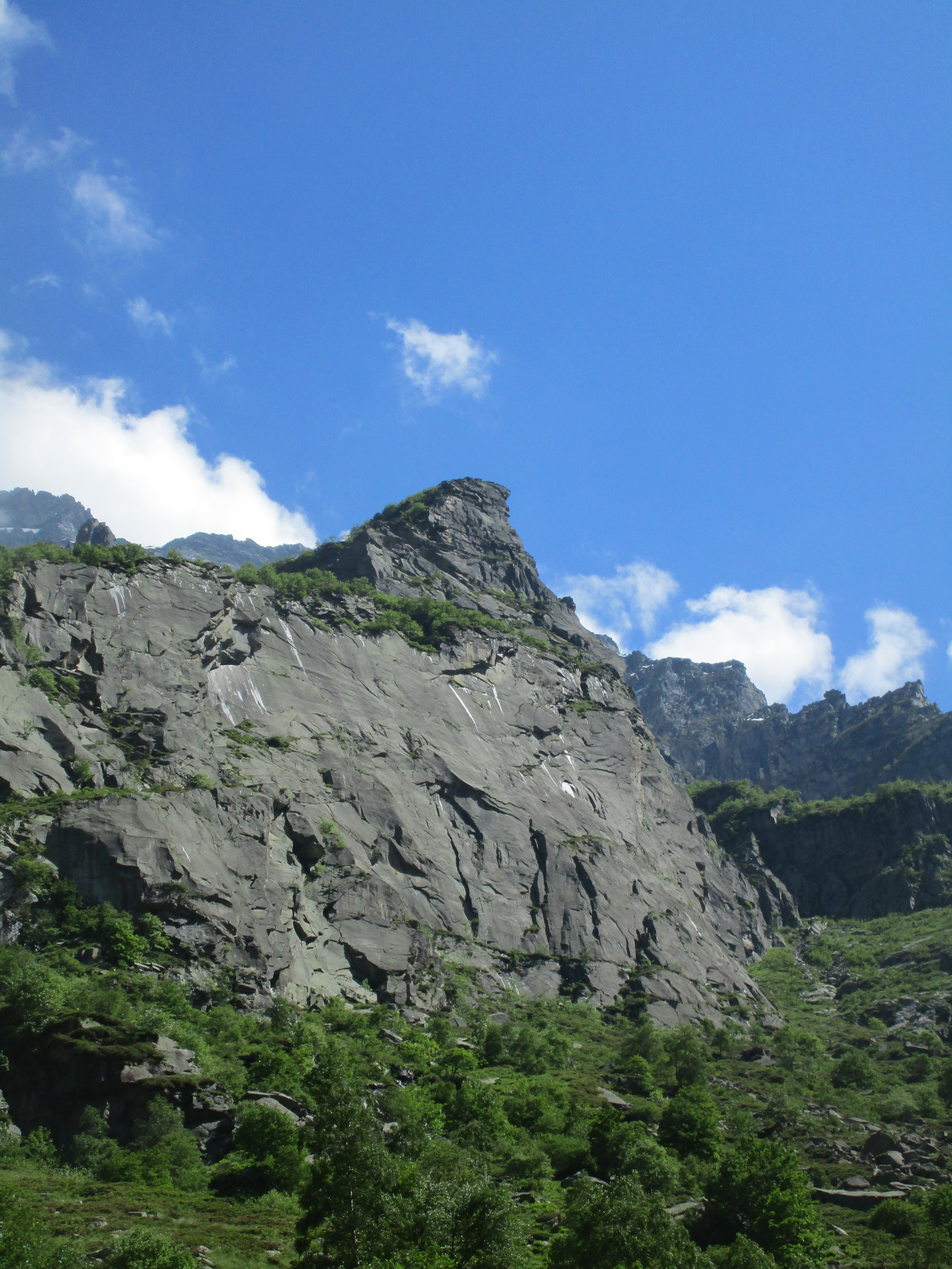 L# | 6a | Monter au fond du dièdre vertical puis traverser à gauche lorsque cela devient surplombant, en utilisant des blocs coincés et une écaille à l'aspect fragile. Relais sur une petite vire aérienne derrière l'angle.