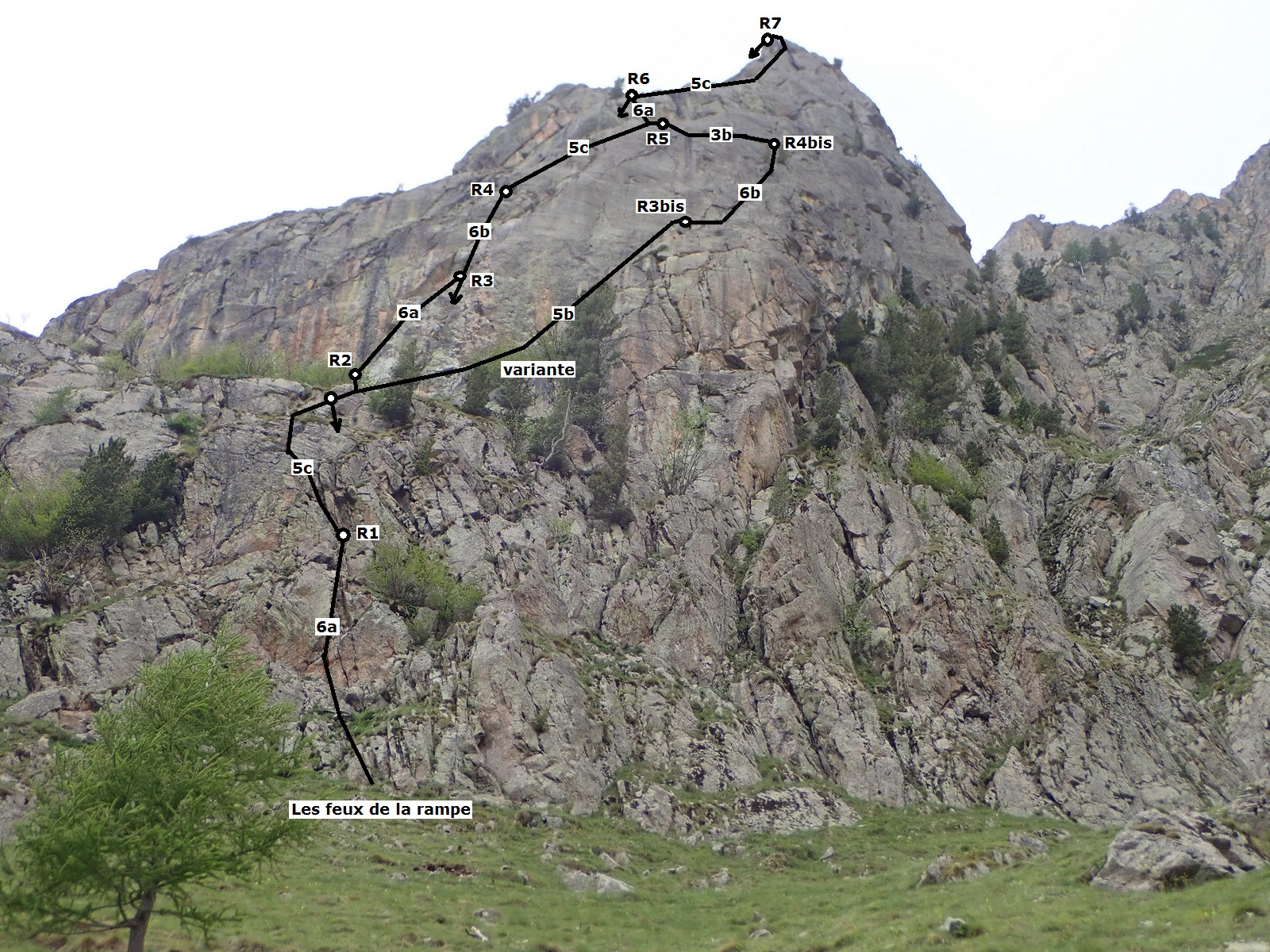 L# | 5c | 40 m | Remonter les ressauts au-dessus en direction d'une cordelette qui indique le passage. Remonter un mur raide, puis une rampe vers la droite qui permet de rejoindre les deux blocs sommitaux. Remonter la fissure entre ces deux blocs pour sortir au sommet. R# de rappel est à gauche.