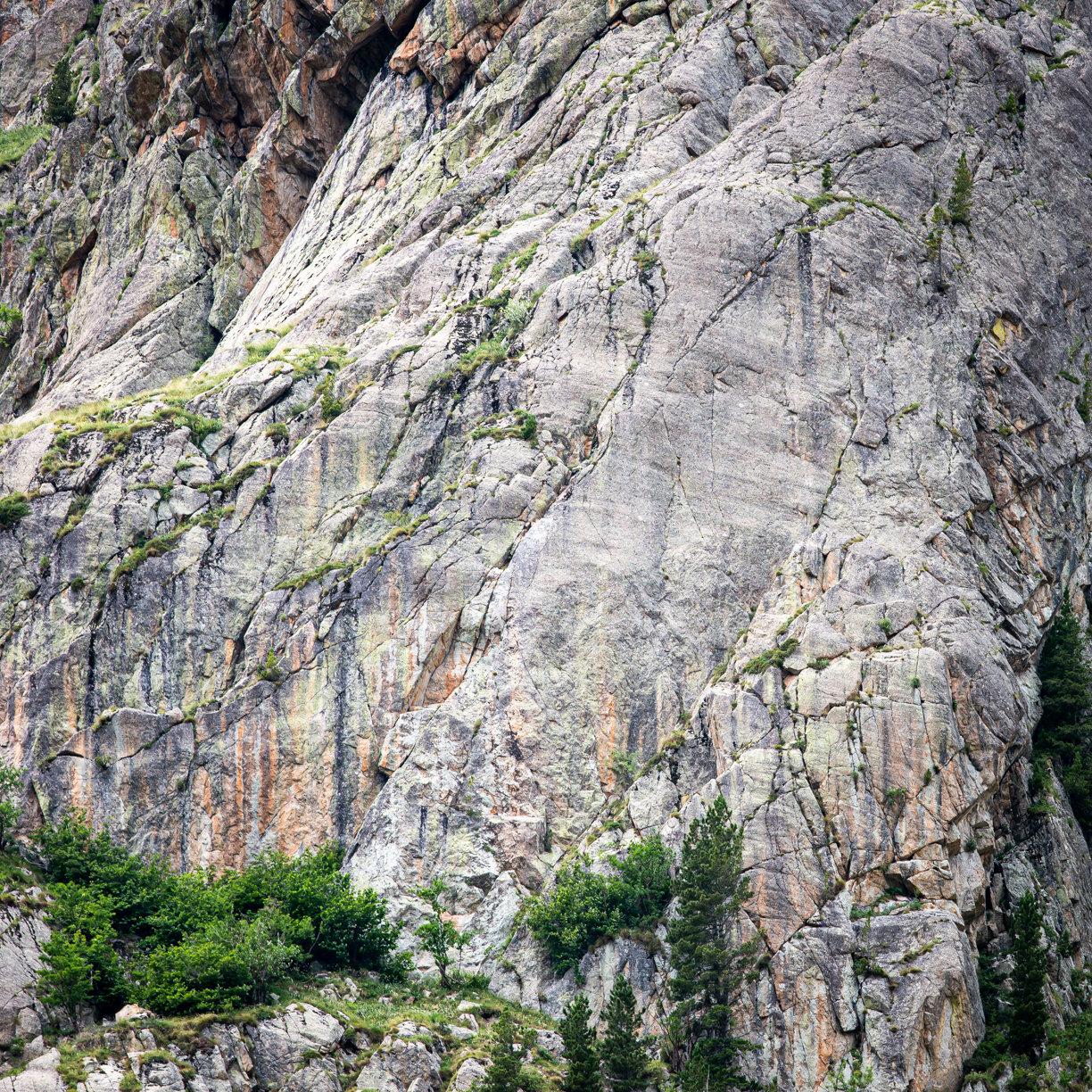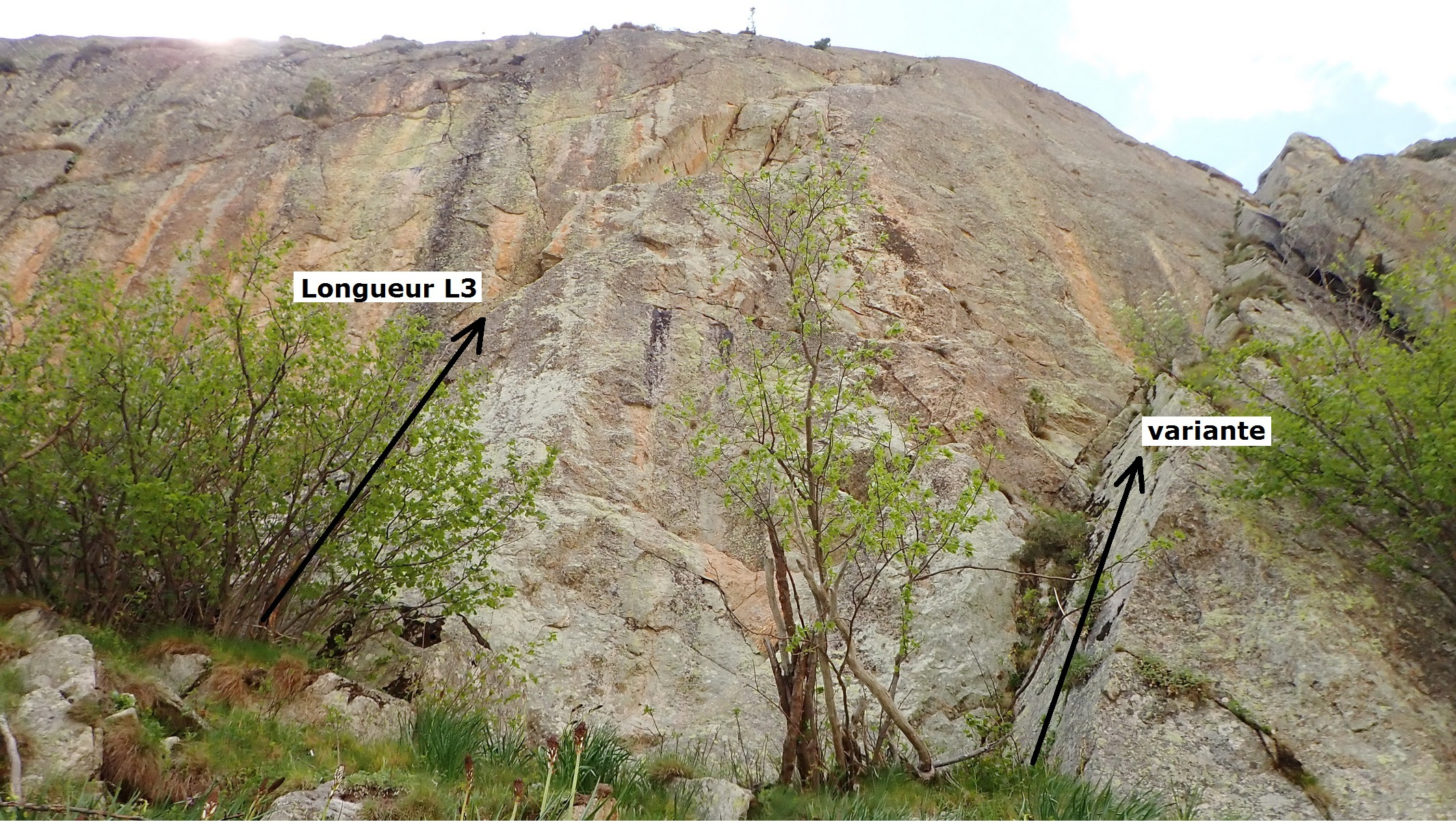 L# | 5c | 40 m | Quitter le relais en se protégeant sur une fissure avant de remonter une dalle raide en ascendance à gauche avec un pas sur réglettes crochetantes avant de clipper un piton avec une sangle. Remonter ensuite des ressauts herbeux pour trouver le relais de rappel à gauche des arbres sur une petite dalle. Continuer au-dessus, laisser la grande rampe facile à droite (variante), et traverser à gauche au pied de la face pour se positionner sous la grande fissure qui raye la face. Faire R# sur des arbustes
