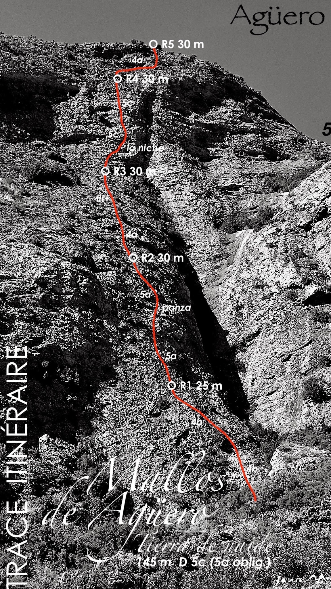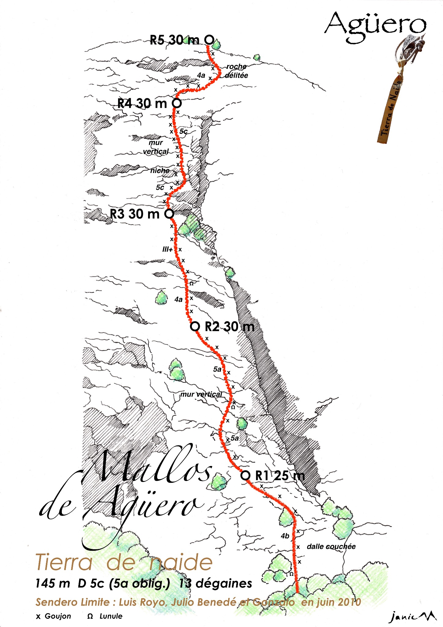L# | 5c | 30 m | 13 goujons | La longueur à ne pas rater, plaque verticale en tirant à droite vers une niche, les points sont sur le bord gauche la ligne se monte à droite pour sortir à gauche au-dessus de la niche puis en suivant le mur sur une ligne qui tire légèrement à gauche.