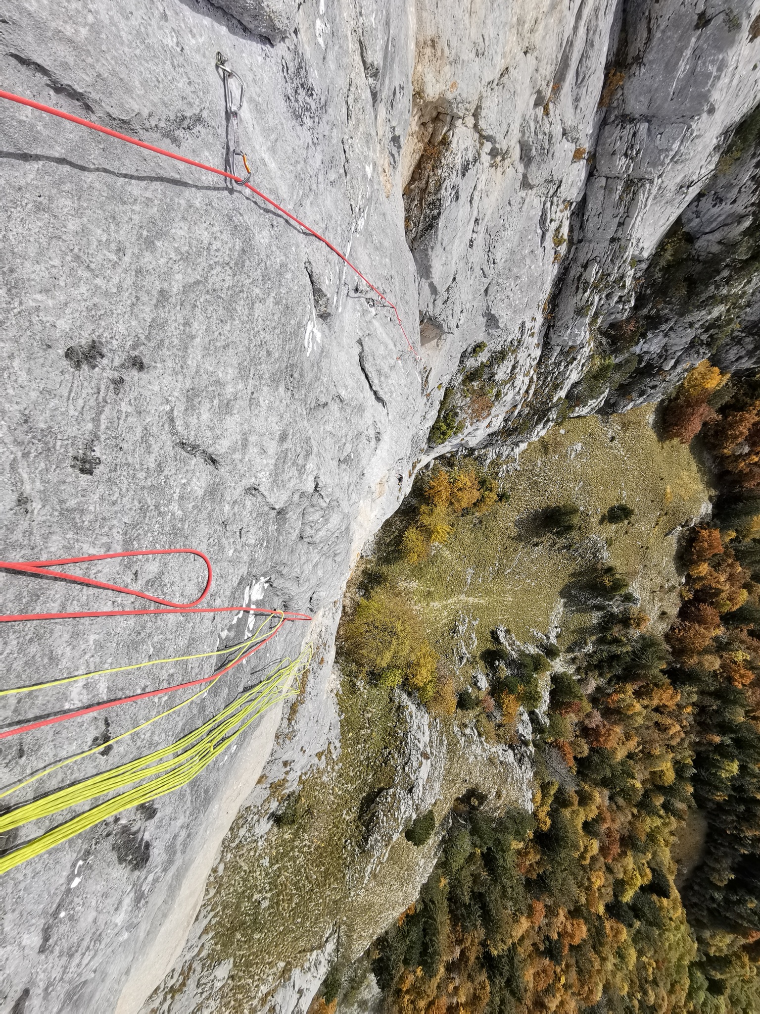 R2: 45 m; on descend dans le couloir en restant à proximité de la face, on rejoint R3 bis (5 m de corde fixe à demeure avant le relais), de là on descend environ 7 m sur corde fixe pour rejoindre un arbre et R3 (1 spit relié à l'arbre).