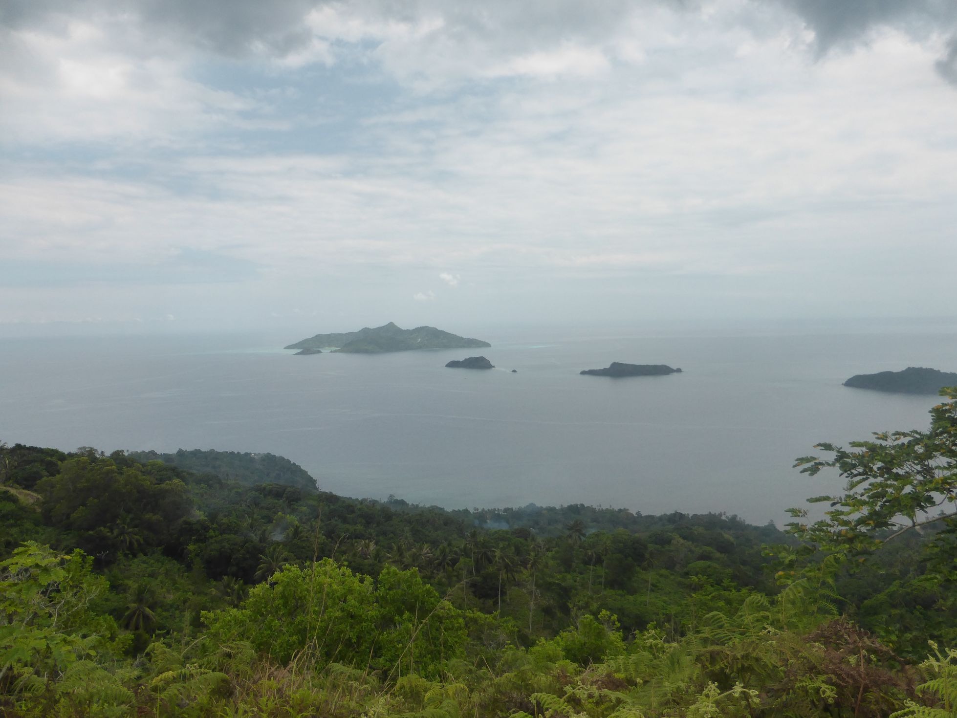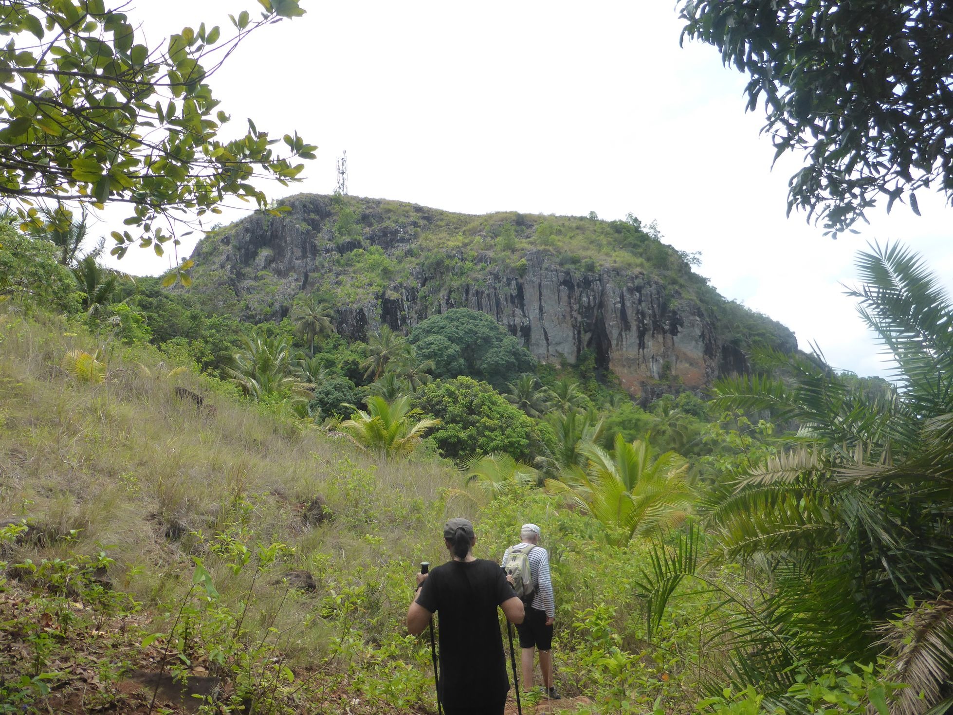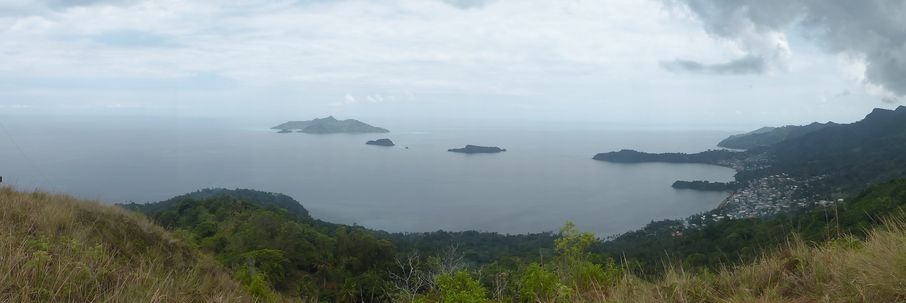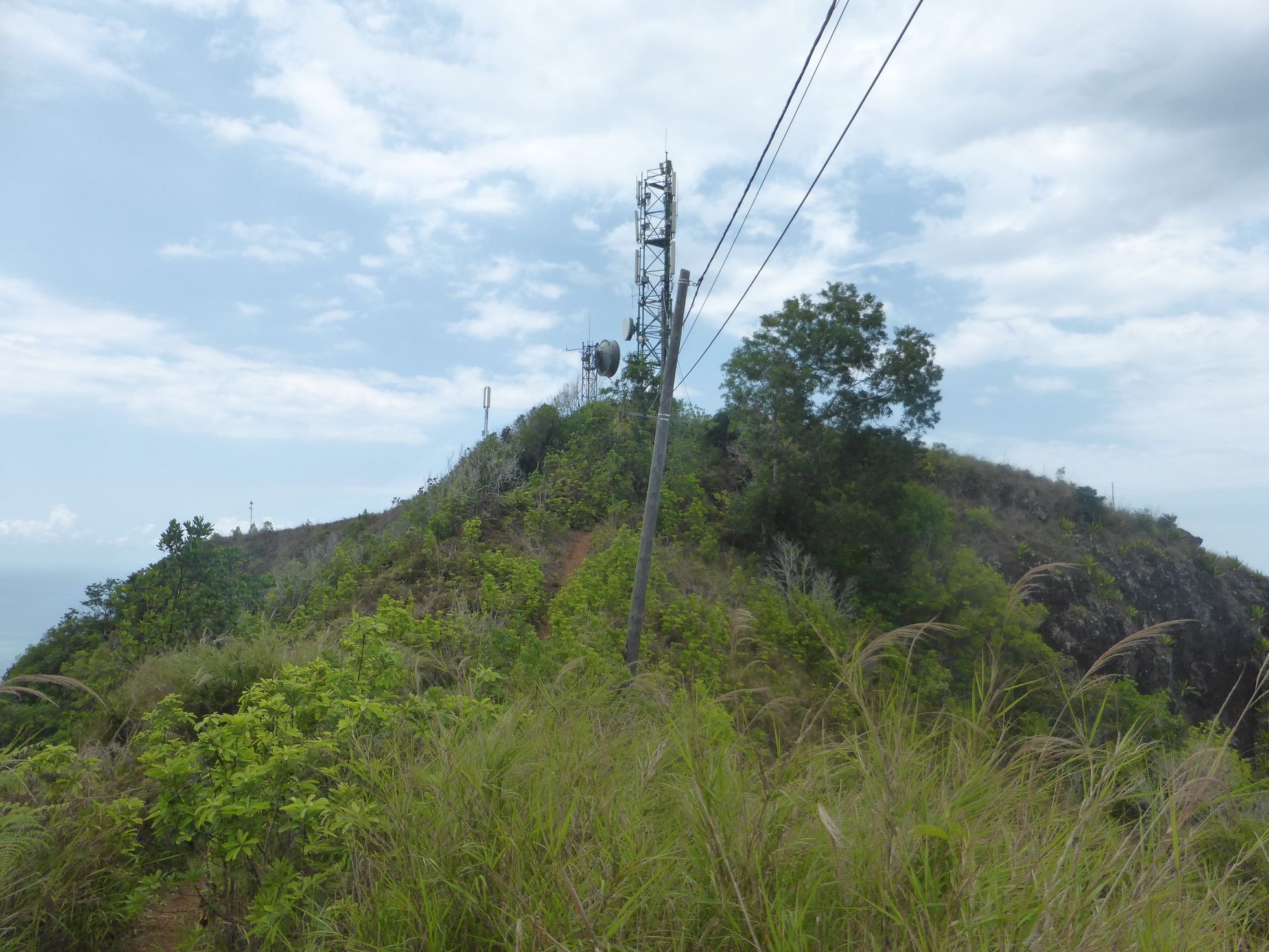 L'escalier bétonnés est irrégulier ce qui ne facilite pas son gravissement mais il n'y a aucune difficulté particulière. On arrive rapidement sur un plateau herbeux dégagé, implanté d'antennes téléphoniques, radars et autres joyeusetés radioélectriques (0h20). La vue est superbe et presque à 360° puisque l'on voit d'Anjouan au Choungui et à la baie de Bouéni. Seule manque Petite-Terre à l'appel. Retour par le même chemin jusqu'en bas des marches puis l'on emprunte le chemin qui descend (donc à gauche maintenant) en direction de Mtsangadoua. Le chemin est évident et serpente au milieu des plantations de manioc, bananiers, ananas et manguiers. On rejoint assez rapidement l'extrémité S du hameau de Mtsangadoua et la route nationale (0h40). Retour à Acoua par la route, ce qui n'est pas le plus agréable de la balade (stop facile ou navette de voiture ou pédibus jambus)(0h30).