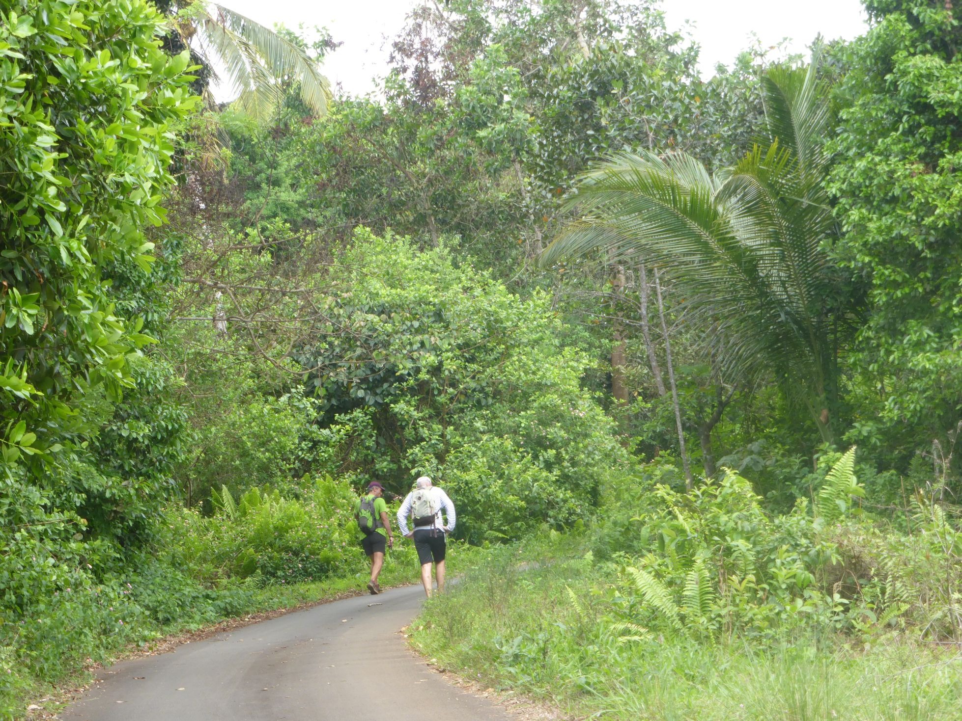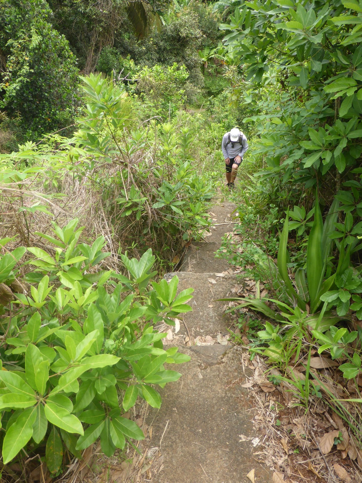Départ depuis l'école du village d'Acoua. On laisse la voiture et on remonte rive droite du ruisseau qui borde l'école. La montée dans les bois est assez raide et les moustiques féroces. On arrive alors sur une zone plus dégagée puis sur la piste forestière (goudronnée) qui monte au faré d'Acoua (0h40). Le cheminement est facile jusqu'au premier faré (vue). On poursuit sur la route qui descend en lacet jusqu'à un carrefour où on laissera à droite la route qui descend côté Dzoumogné. On continue tout droit jusqu'à un deuxième faré, le goudron disparaît (0h40). Le chemin longe un petit rang de falaise par la gauche avec une belle vue sur le "signal" d'Acoua. Le chemin descend jusqu'à un petit carrefour. On continue tout droit en laissant descendre à droite le chemin du retour et on attaque immédiatement les 210 marches.(0h10)