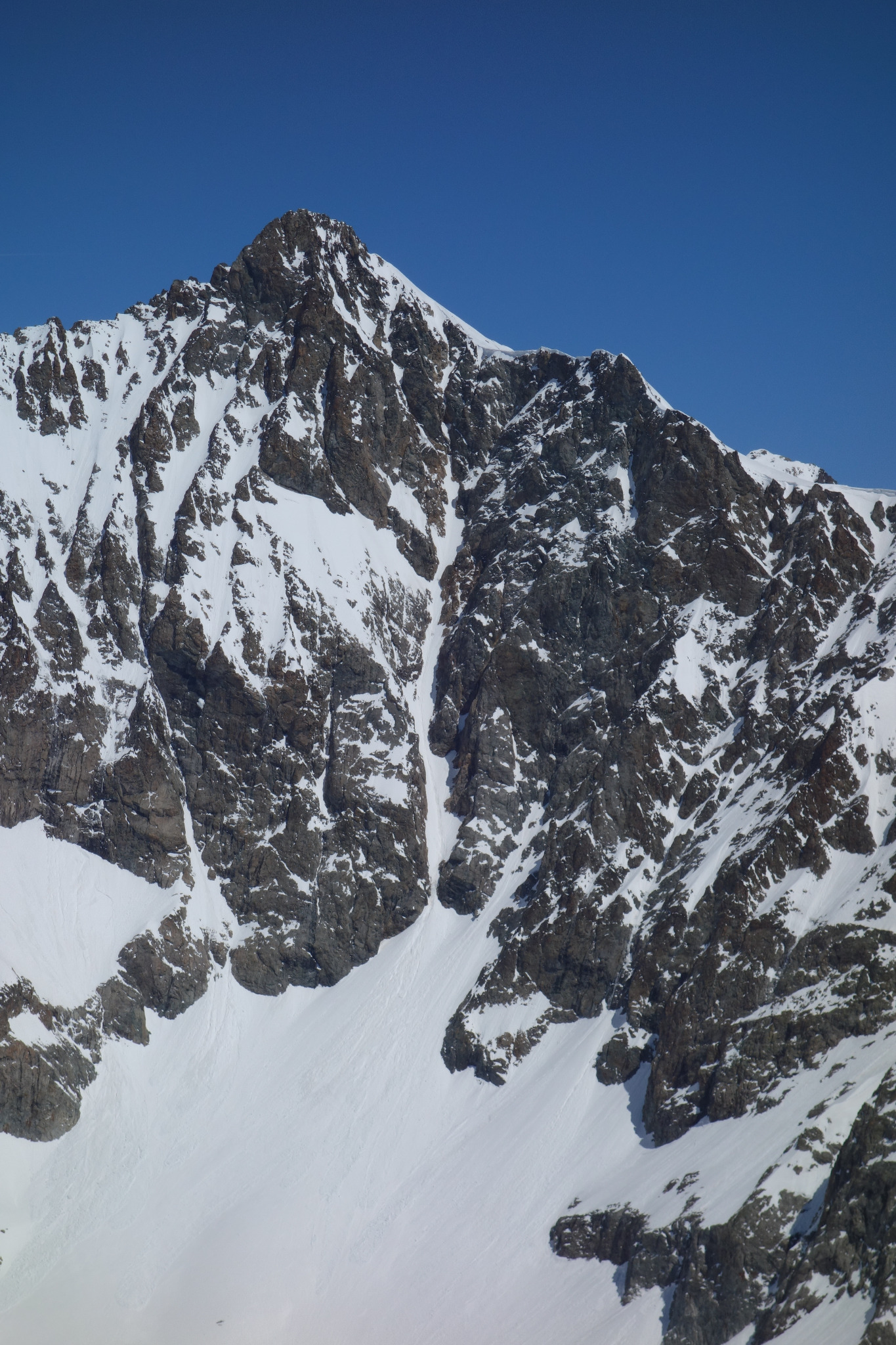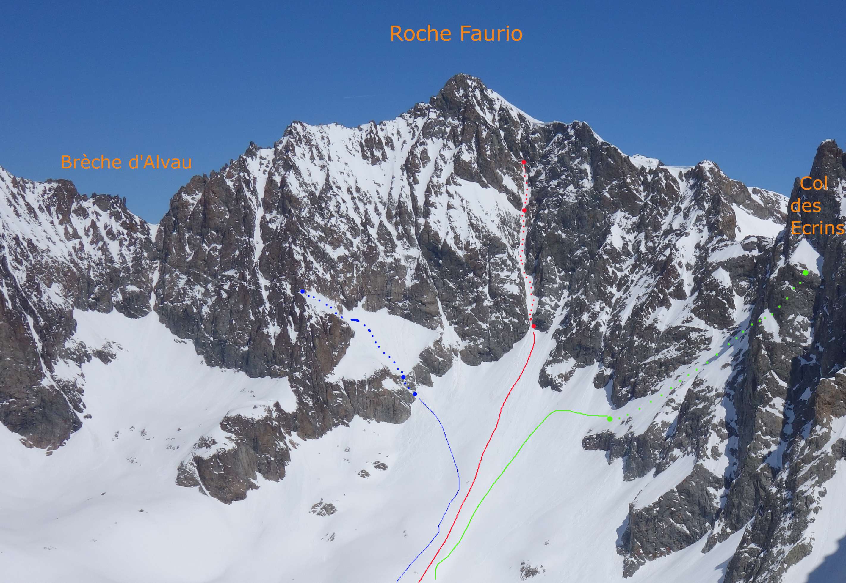- Une alternative raide et exposée se trouve également en face SSW de Roche Faurio (ouvert par Louis Volle) : la Selle SSW de Roche Faurio (cf photo ci-dessous). Couloir d'attaque très raide avec mixte possible, le reste moins raide mais expo.