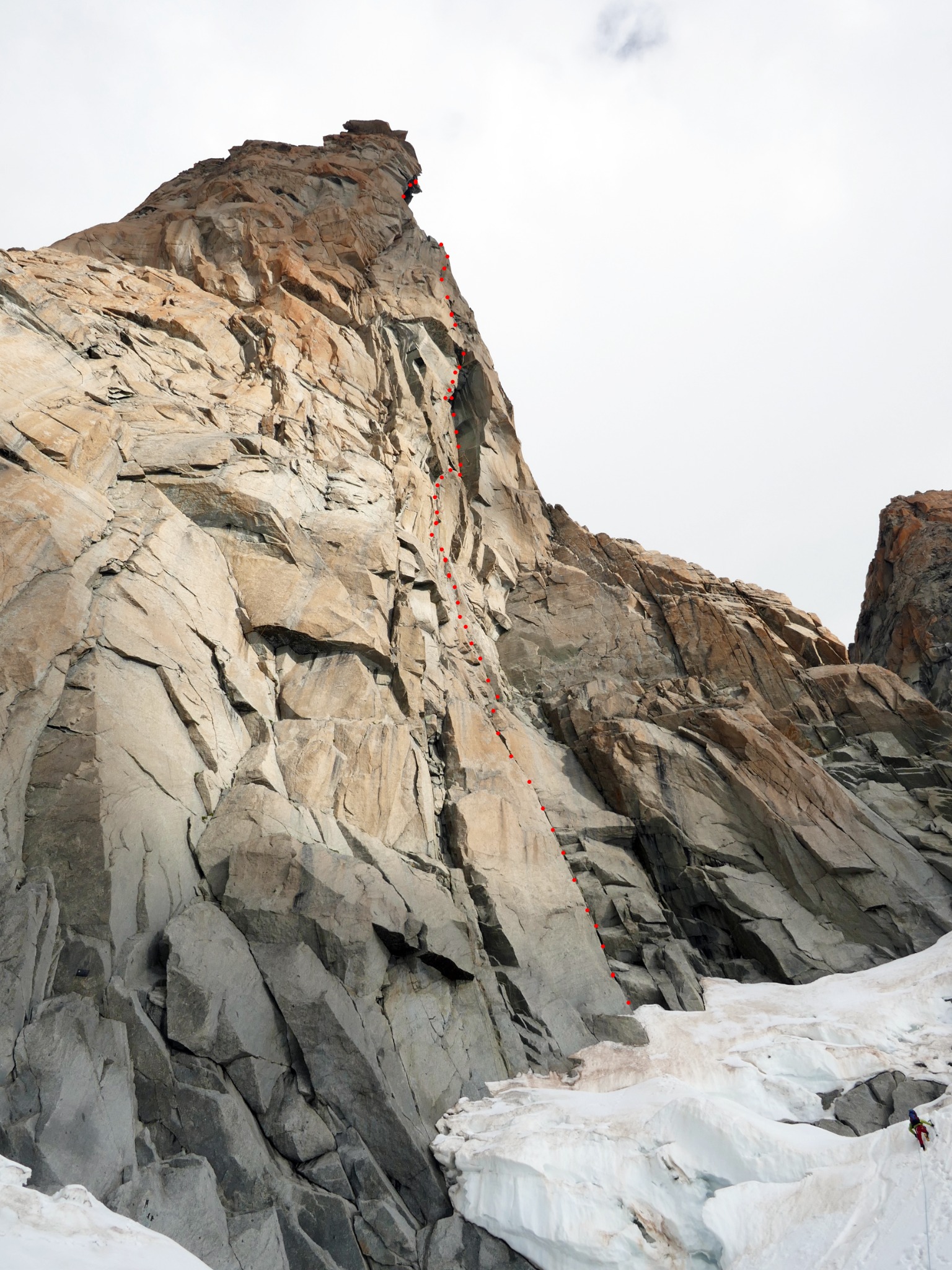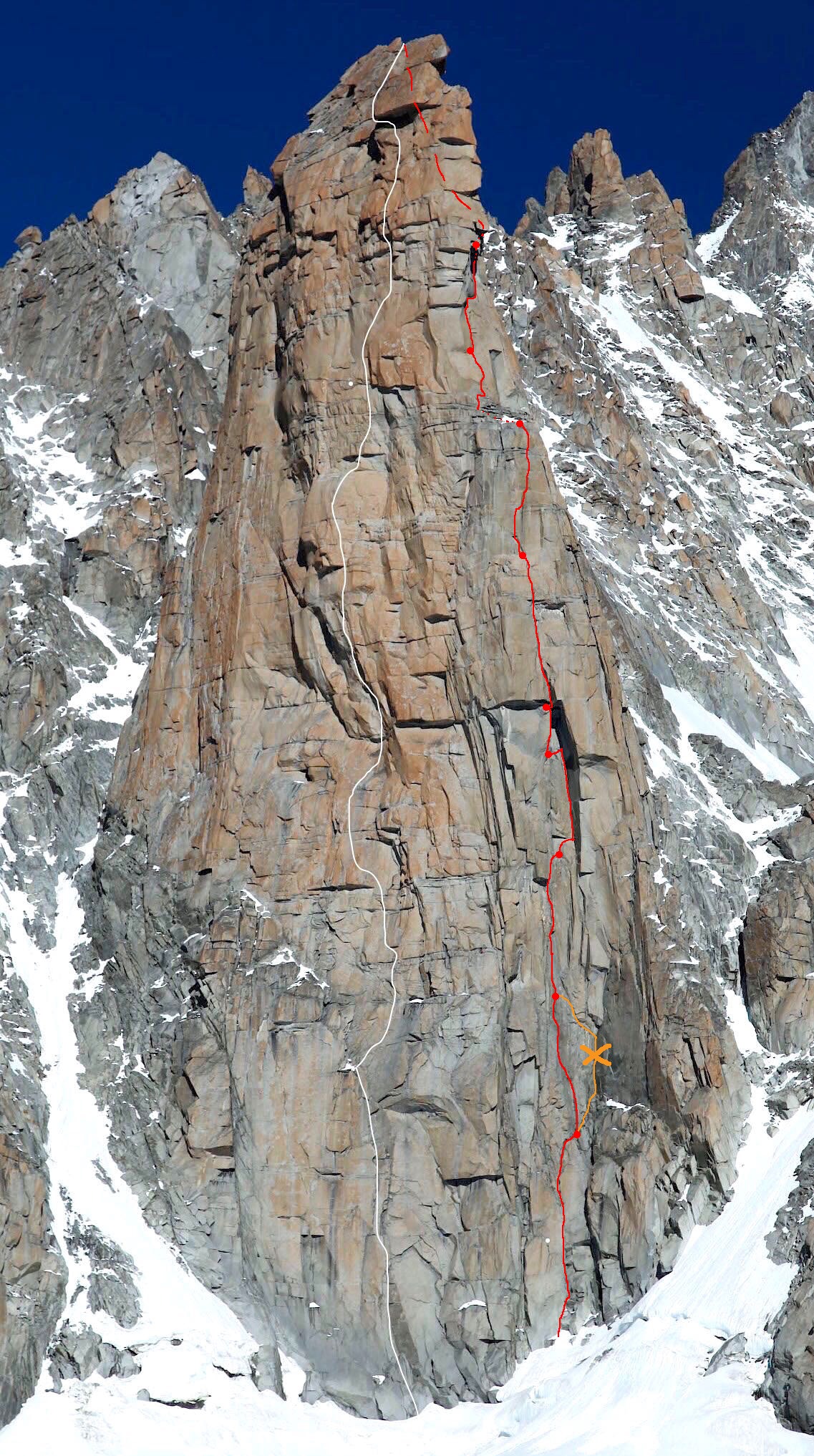 !!!Le récent topo Mont Blanc Italian Side (Versante Sud), bien qu'offrant une description très complète de l'itinéraire (et globalement juste d'après ce que nous avons pu en juger) en présente un tracé à l'évidence partiellement faux, surtout dans le bas de l'itinéraire.