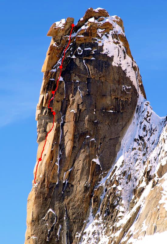 Il s'agit d'une combinaison des premières longueurs d'Alta Tensione, du mur de 40 m de la Bonatti-Ghigo, et d'une fin originale.