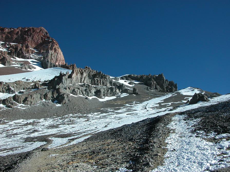 Grosse journée (et souvent la première avec un gros sac - merci les mules!! Le portage peut se faire en deux jours, avec une marche d'acclimatation par exemple). Compter de 5 à 7 heures (selon votre charge). On peut diviser cette section en deux en dormant à Camp Canada vers 4950 m (avant le changement de pente, attention pas d'eau ni de neige en fin de saison, se renseigner) ou Camp Alaska (approx. 5250 m) au pied du Manso.