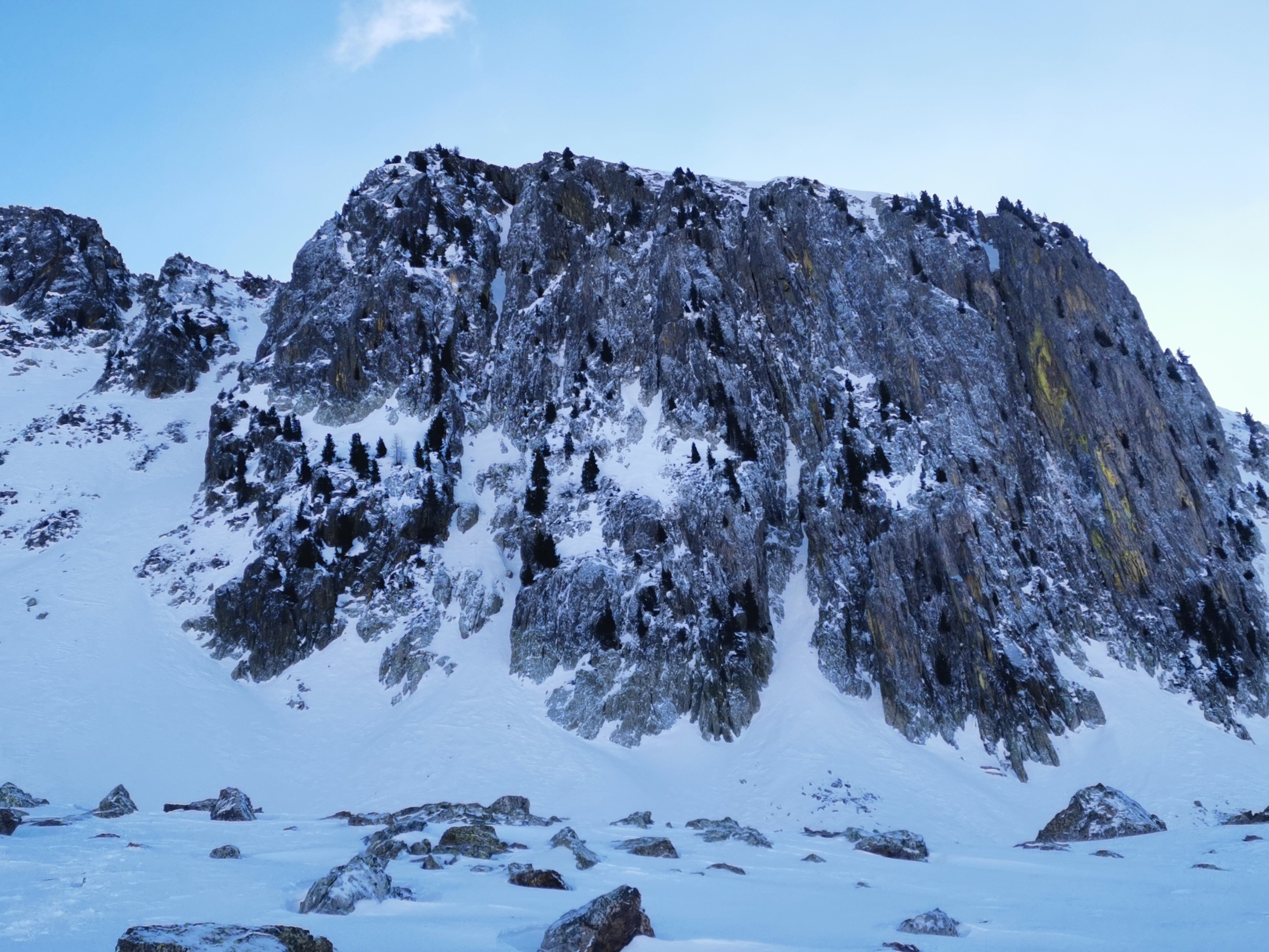 L# | 45° à 60° | 100 m | Remonter le cône de déjection jusqu'à un relais sur deux pitons reliés situé à gauche sous le premier ressaut. Remontée possible en corde tendue et/ou longueurs ou les deux, selon les conditions. Possibilité de constituer un relais intermédiaire sur le côté ou sur îlots rocheux.