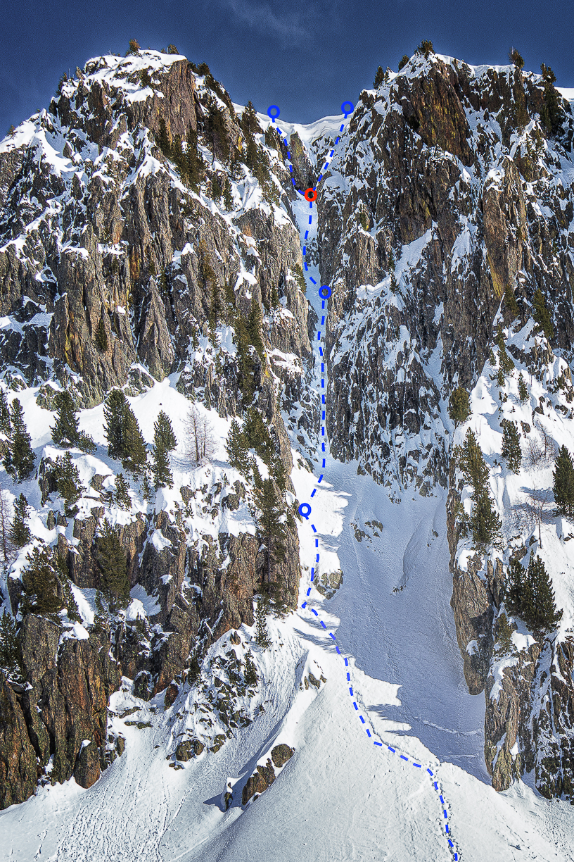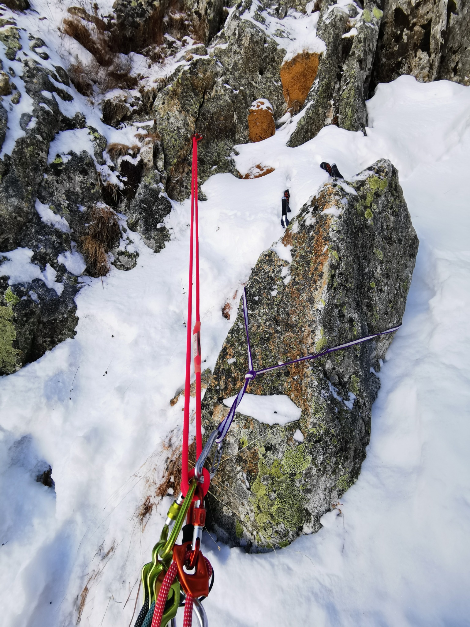 En cas de risque d'avalanche, il peut être préférable de descendre en rappel dans la voie, en commençant par un premier rappel sur corps mort (à prévoir).