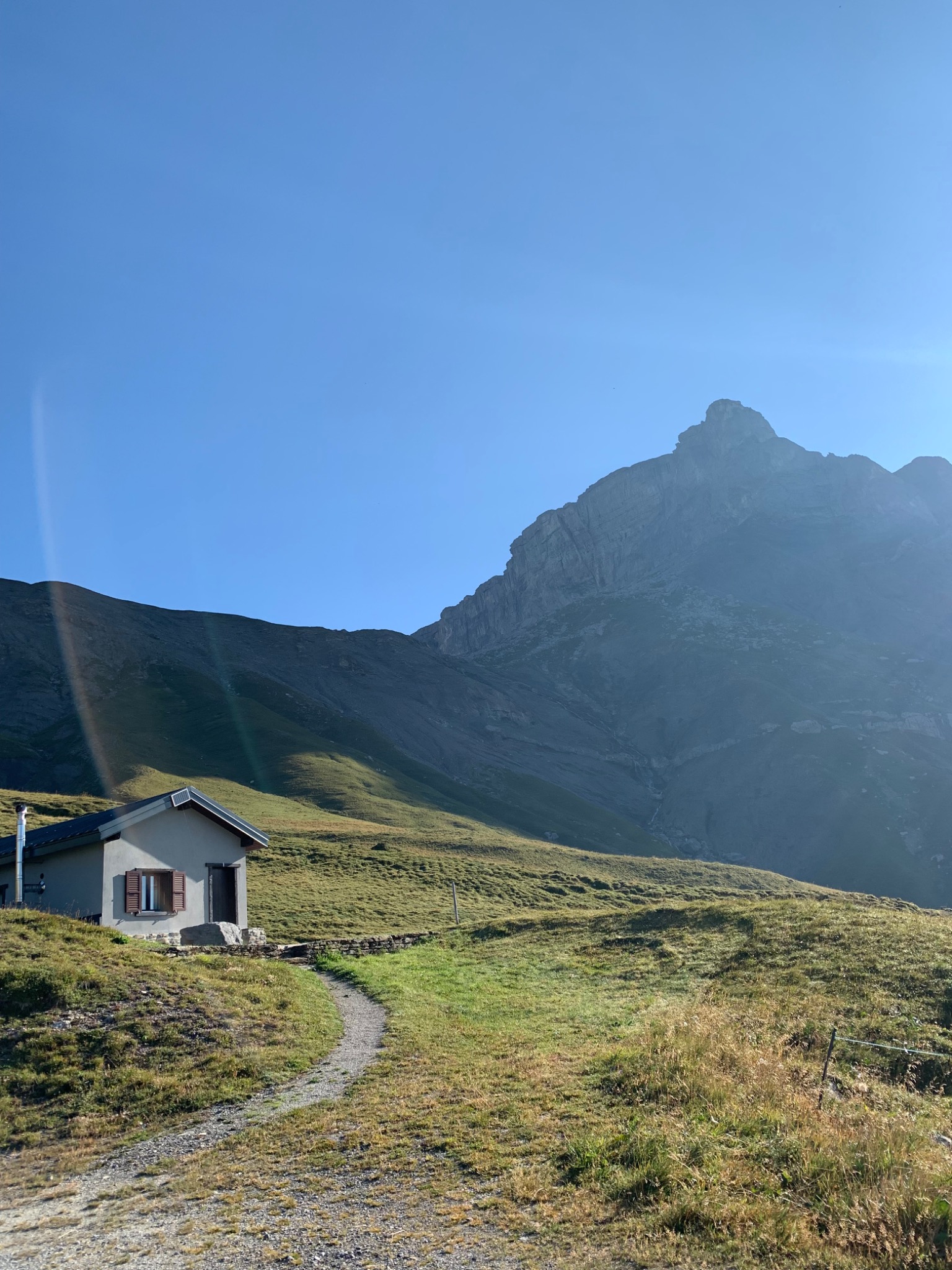 Sur la route qui mène au col du Santesch, peu après "l'Hôtel restaurant du Sanetsch", parquer à droite au point 2110 devant une petite maison. Remonter la lèvre herbeuse (celle de gauche, cairns vers la fin)) qui rejoint le pierrier avec une sente le long d'une conduite d'eau. Suivre la conduite/sente pour rejoindre le plateau et monter à vue à travers une zone de bloc jusqu'au départ de la voie (cairn plus petite grotte).