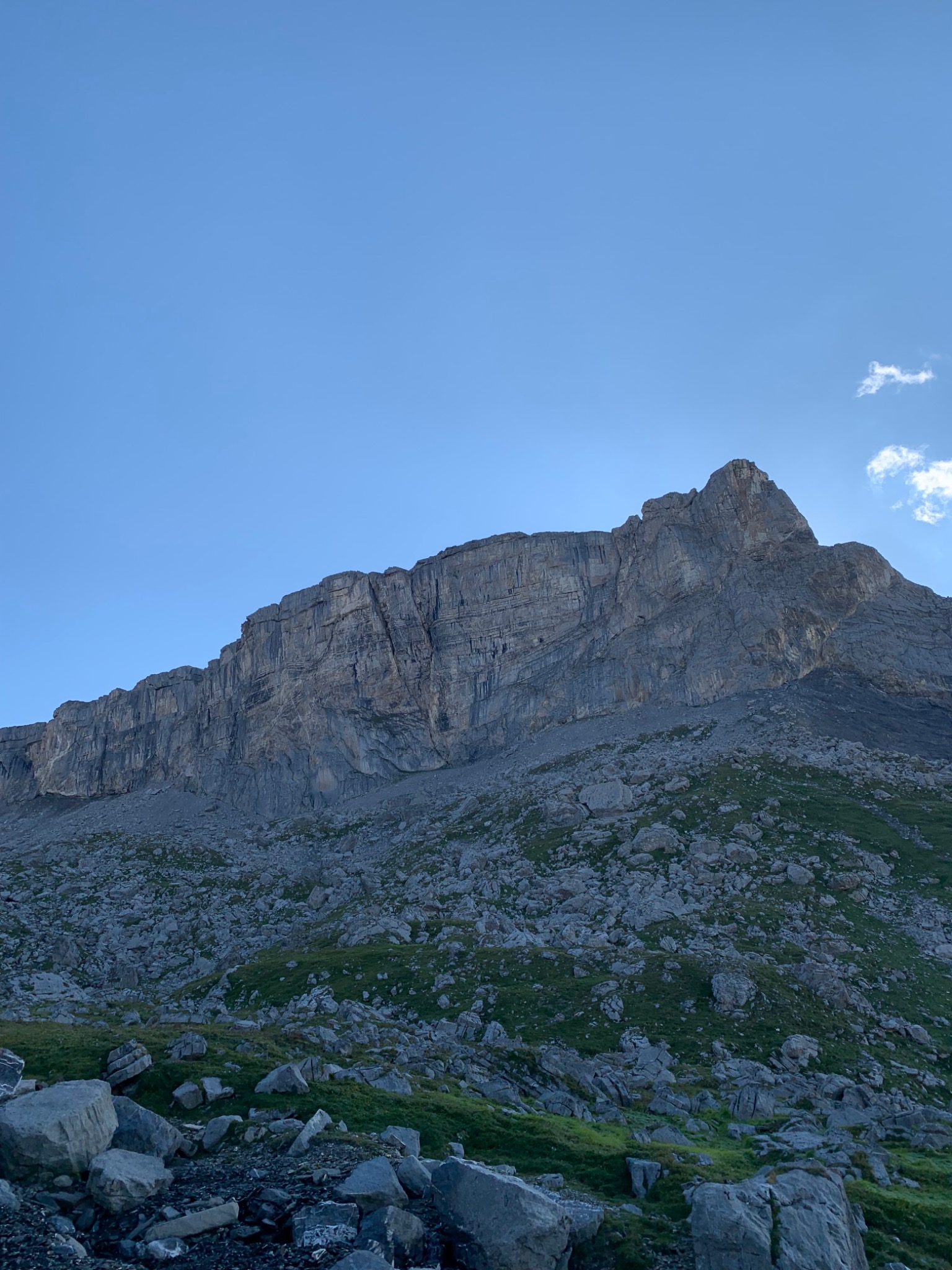 L#2 | 6c | 25 m | À la verticale du relai sur les trois premiers spits. Ensuite traverser à droite, puis tout droit jusqu'à un petit crochet à gauche vers la fin. Rétablissement sur une vire herbeuse pour trouver un relais comfortable avec deux spits non reliés.