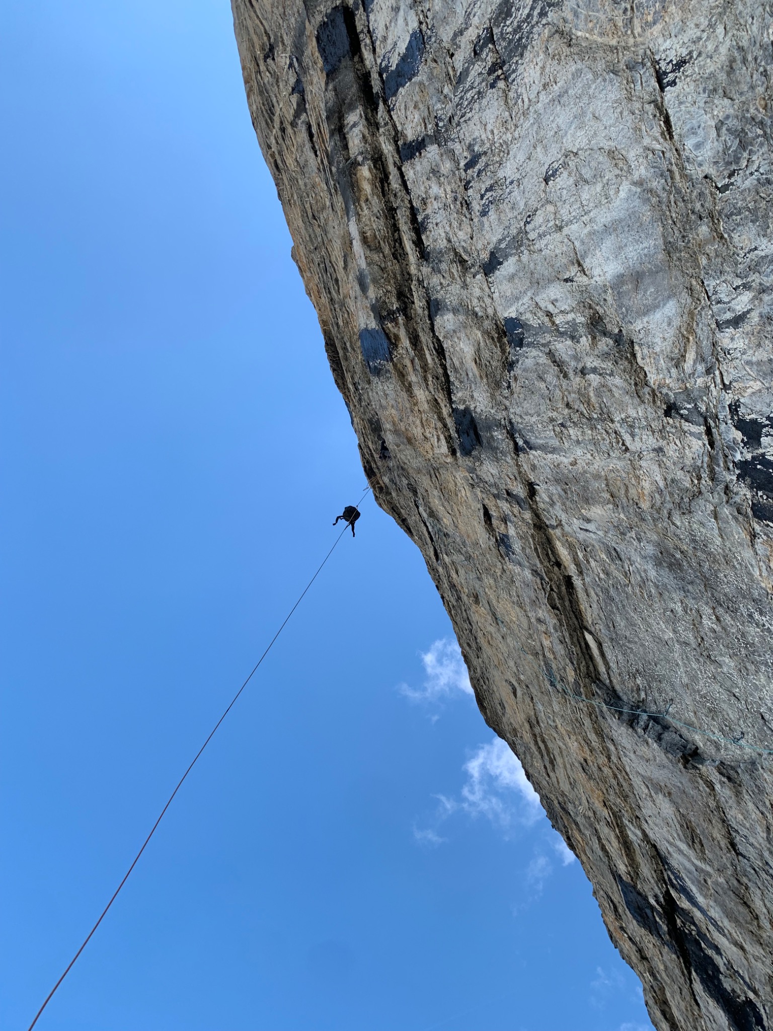 Lorsqu'on a atteint le relais du premier 7c, il serait aisé de redescendre en rappel car on rejoint facilement la vire de R3.
