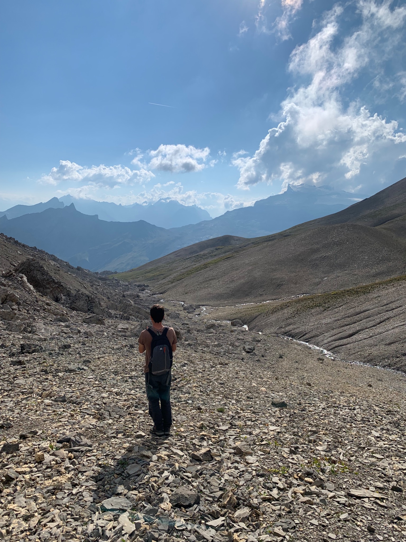 Longer le bord de la falaise en suivant les cairns en direction du NE. Après environ 30min, trouver une encoche qui permet de rejoindre le vallon et descendre le long du ruisseau jusqu'à rejoindre le sentier de l'approche.