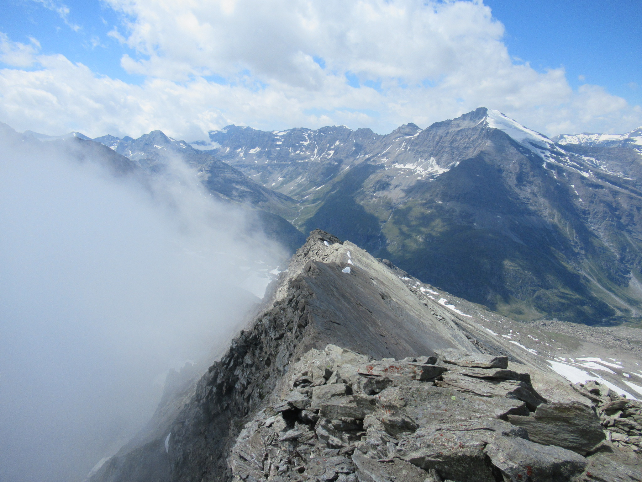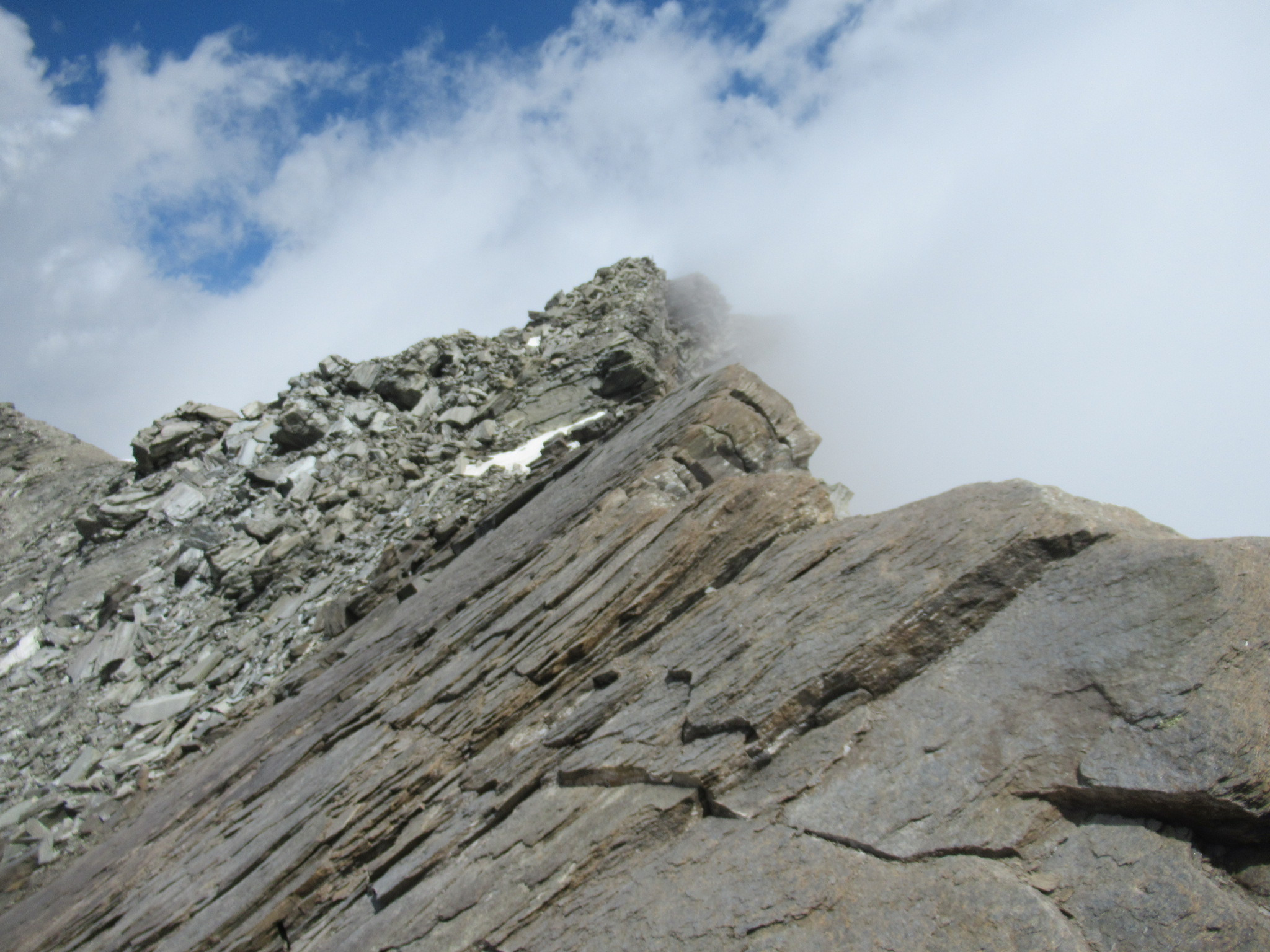 À la jonction de la crête SW et de l'arête S, l'arête se couche. Franchir sur le fil une courte portion aérienne (des vires versant italien permettent d'éviter le fil), puis une belle dalle peu inclinée. À la sortie de la dalle, gravir le ressaut sommital (quelques pas de 2).