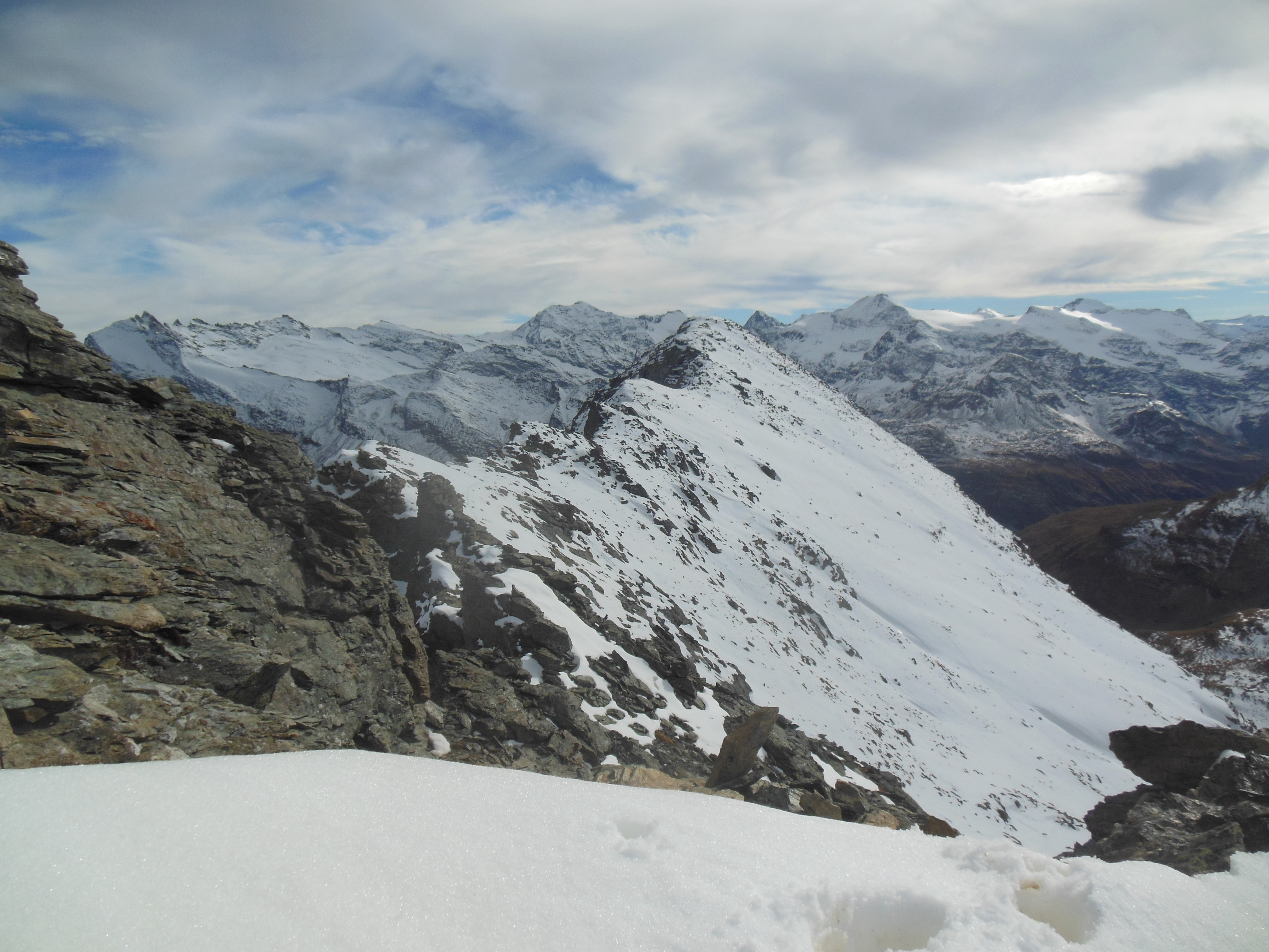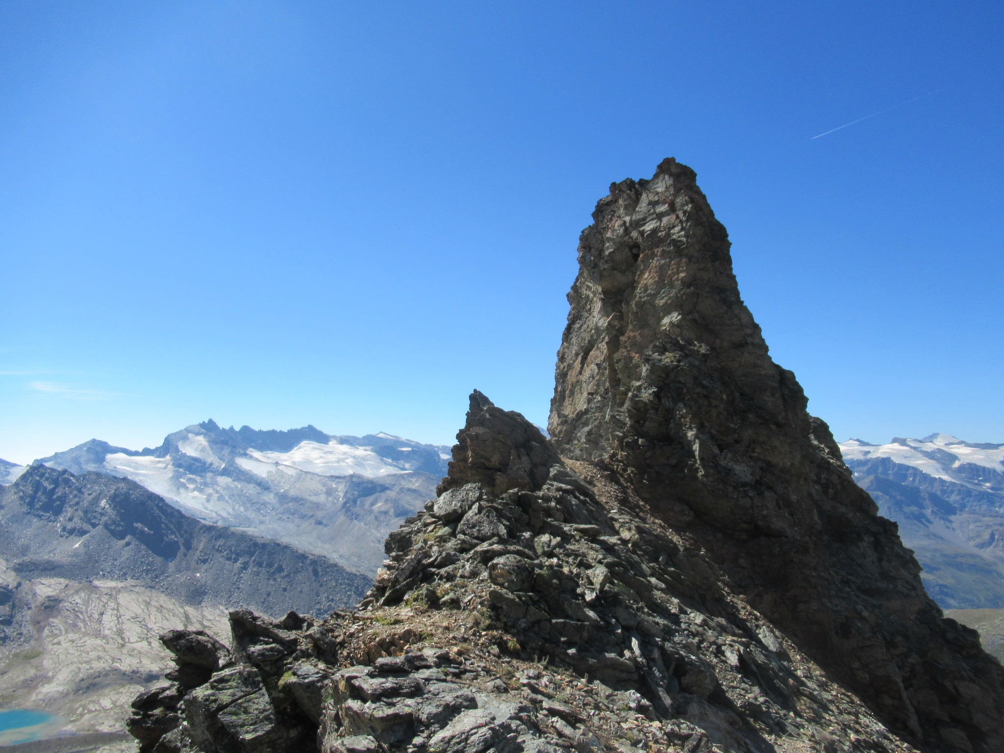 Du Col on bute rapidement sur un grand gendarme. Le contourner par des vires versant W (on pose un peu les mains). Le reste de l'arête est facile jusqu'au sommet.
