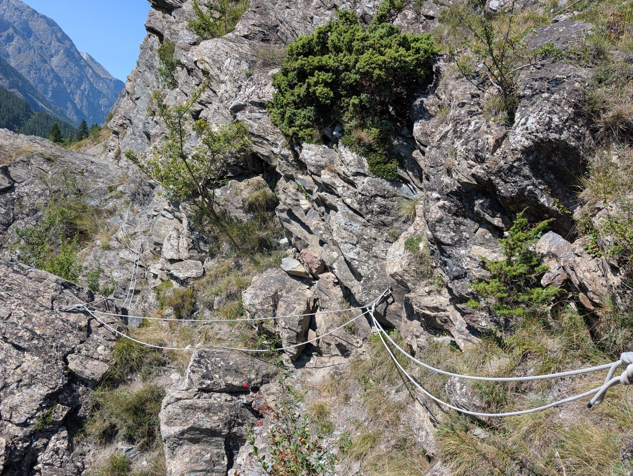 La suite (3 max, corde tendue) est constituée d'une arête un peu plus marquée, toujours bien équipée, avec par endroits des points de peinture rouge qui limitent la recherche d'itinéraire au minimum. La première véritable difficulté réside dans un pas de désescalade (ou en franchissant le pas séparant un bloc d'une enjambée) avant le ressaut final de cette section, plus raide. Cette difficulté peut être évitée en moulinant le second et par un court rappel (5 m) sur l'anneau au sommet du rocher. Relais possible en bas à gauche du mur plus raide sur un becquet rocheux (prévoir sangle ou anneau de corde).