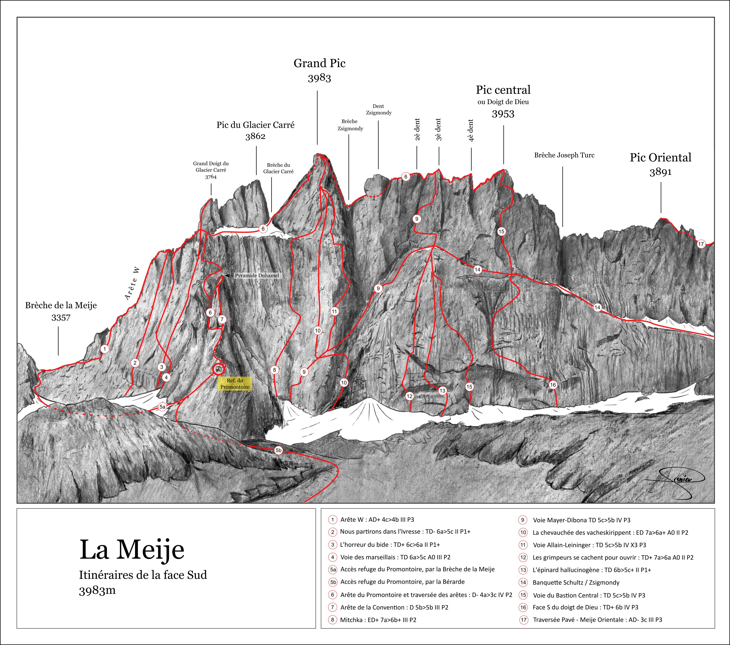 *Le topo de la descente ainsi que le Labande indiquent de passer sur le fil de l'arête NW. Considérant la grande pourriture de la face N cette solution est probablement à préférer au passage en face N par les cordes fixes. Il semblerait que la corde qui sert au rappel (beal rouge) soit issue d'un accident et laissée au cours du secours.*