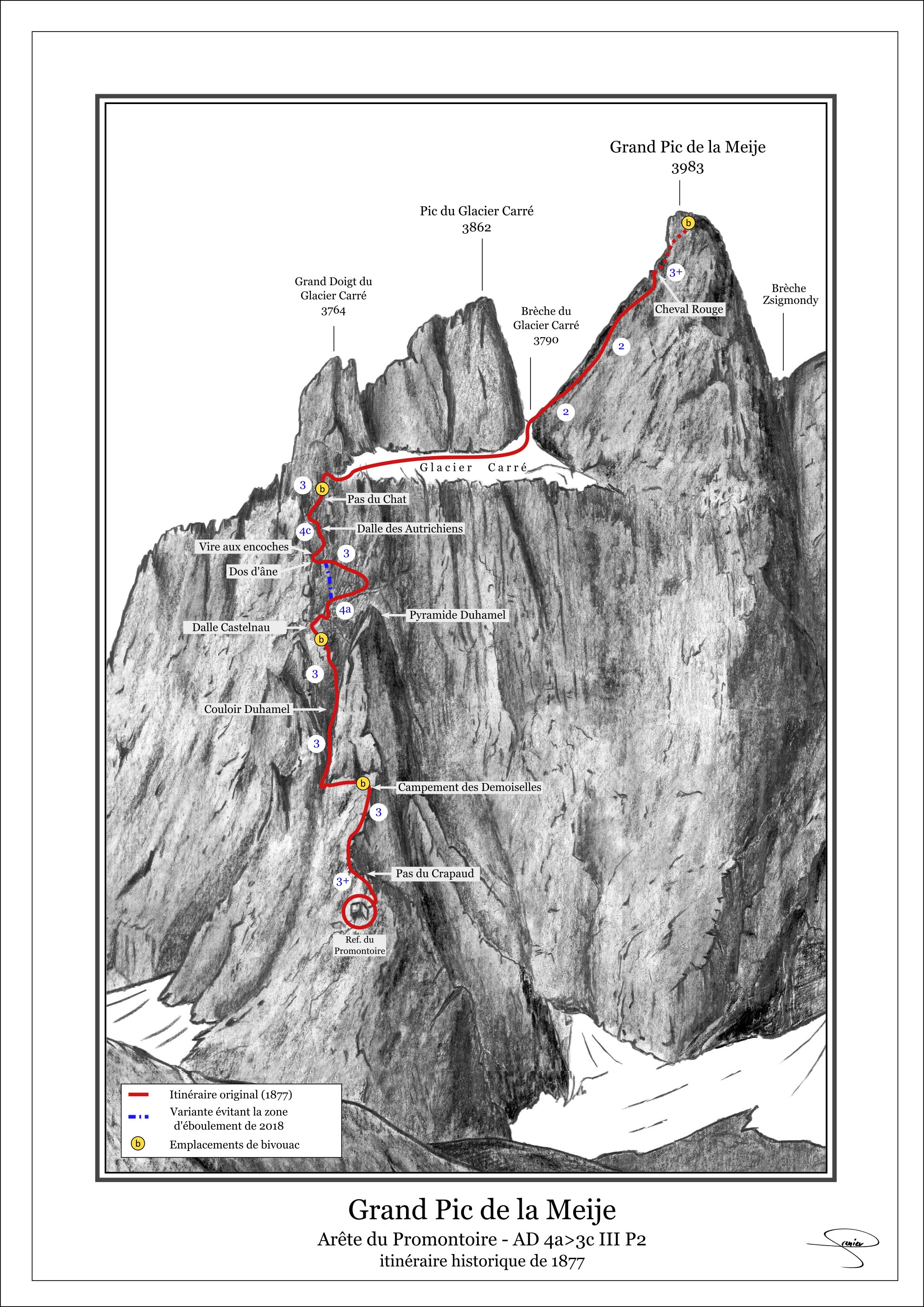 Pour une descente sur le promontoire et/ou la Bérarde : se renseigner sur l'état du glacier des étançons (glace et crevasses).