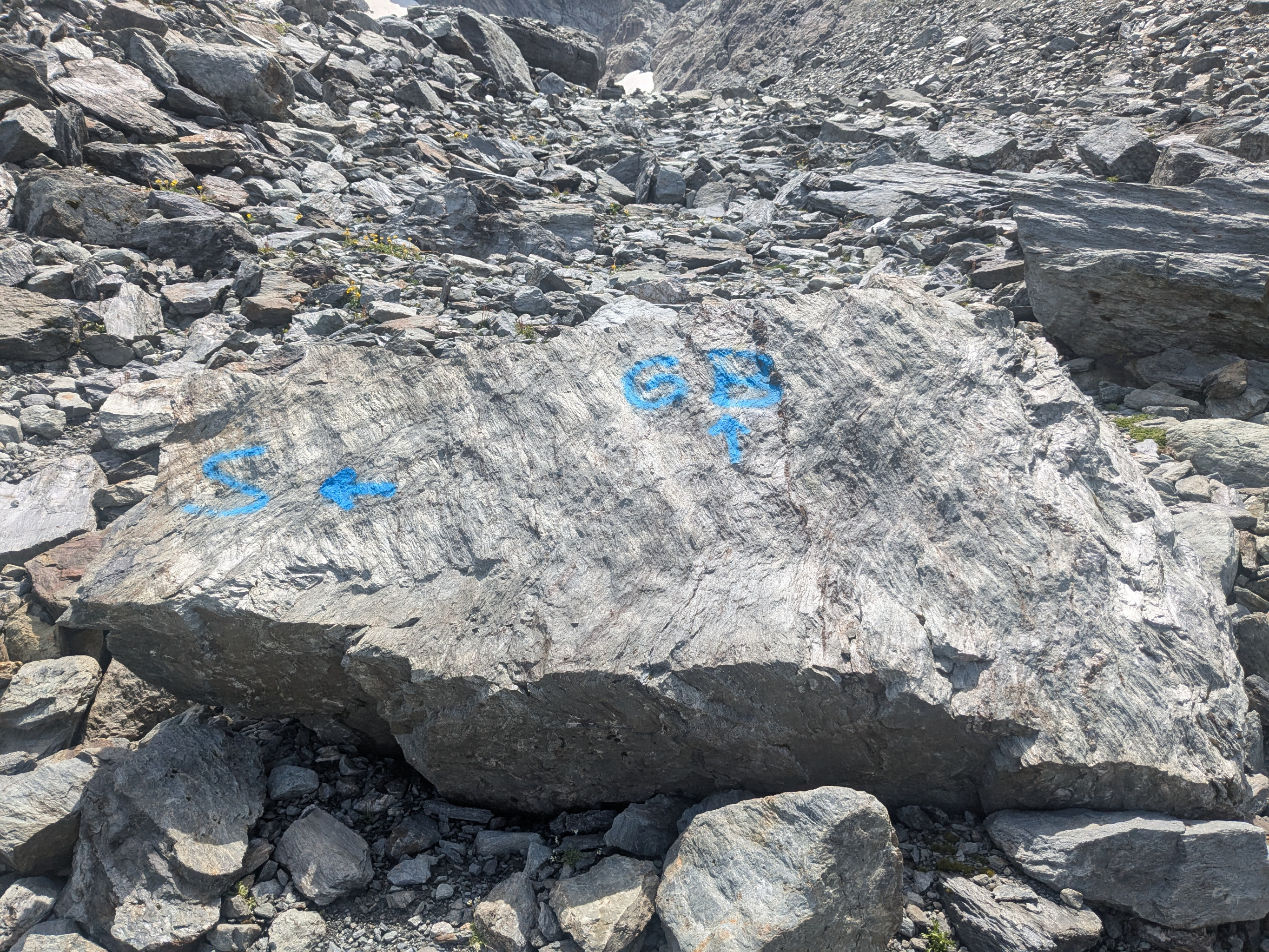 Suivre ensuite les cairns à travers la moraine pour remonter le long des flancs de la Becquetta (raide, exposé). Au point culminant (2710 m) on rejoint les itinéraires classiques d'approche des glaciers depuis le refuge. Suivre les cairns en descendant. Des bifurcations sont marquées en bleu (GB = Grand Bec, S = Sauvire).
