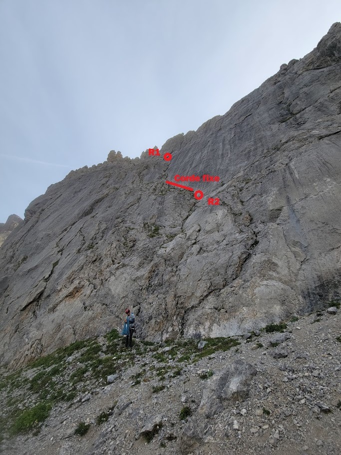 La suivre quelque mètres, jusqu'à un second relais de rappel. Un deuxième rappel de 30m amène au sol. Avec un corde de 50m, quelques mètres de désescalade facile.