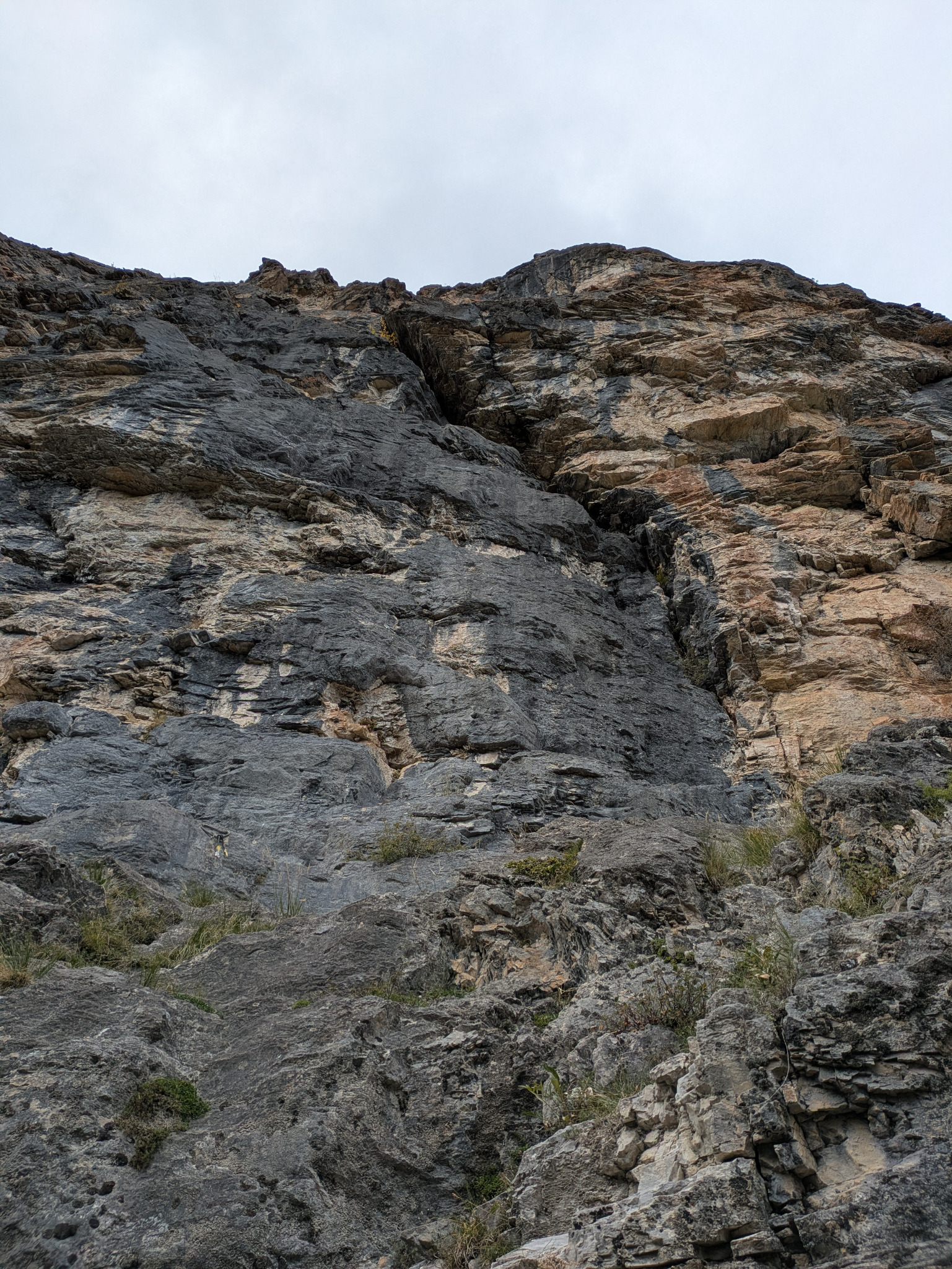L# | 6a+ | 25 m | Progression dans la fissure. Typé bloc, succession de murs/ressauts entrecoupés de vires. Pas évident et humide par essence. Dernier ressaut avant le relai très beau (3D). Relais à relier.