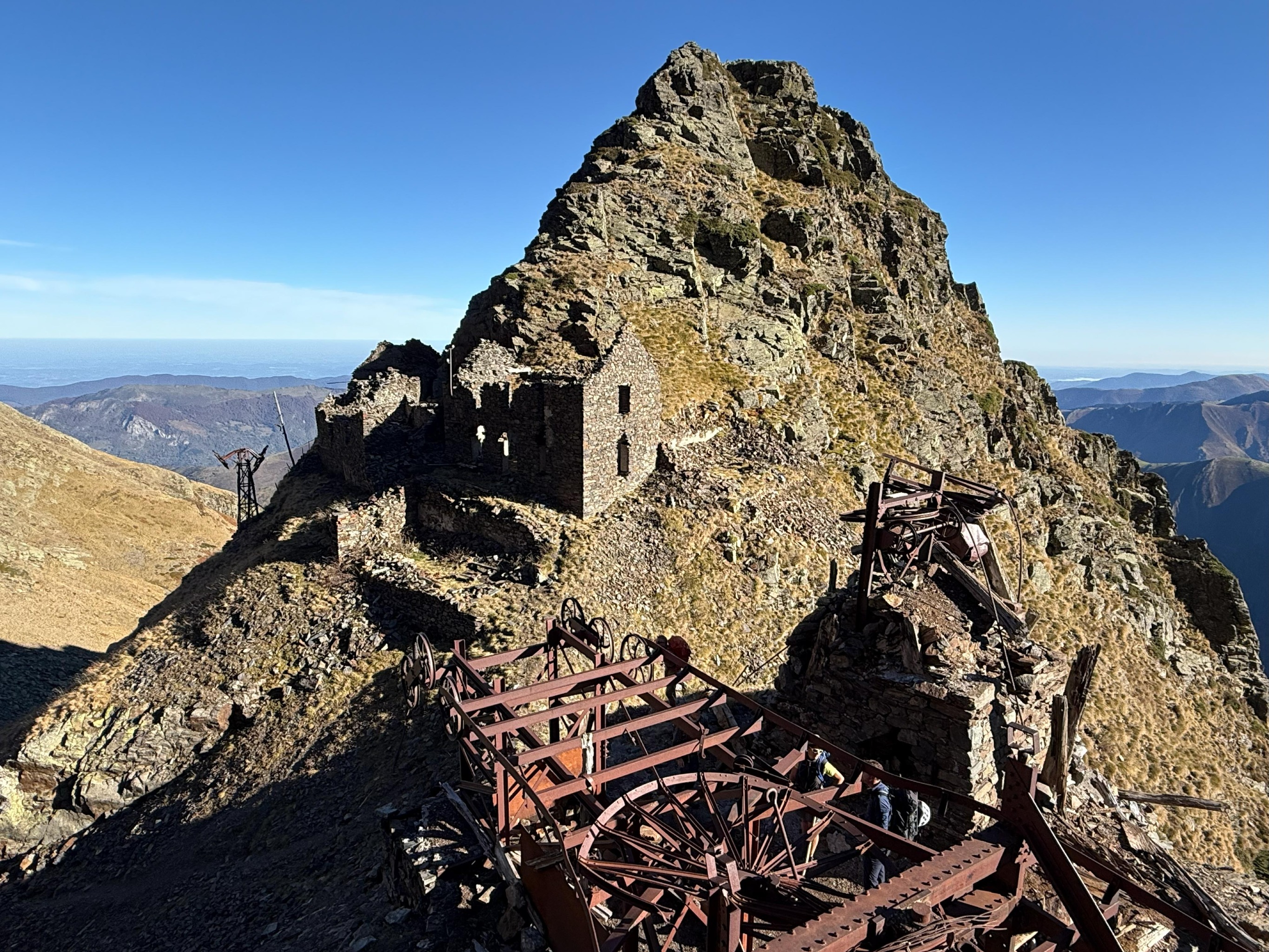 Des baraquements, se diriger au Sud, vers la face Nord-Est. Une première galerie vide est accessible. La contourner par le haut et suivre ce qu'il reste du sentier. Celui-ci est fortement dégradé par endroits sur un terrain très exposé. Cette section est équipée par endroits de spits récents ou de vieux pitons. Suivre ce chemin jusqu'à la galerie principale (Travers banc). Juste après cette galerie on arrive à la forge et le chemin bifurque à 180° pour monter sur un plan incliné en direction du Nord. Remonter sur quelques dizaines de mètre pour arriver sur une plateforme (vestiges de poulies, puits vers les galeries inférieures). Les galeries continuent dans la face mais l'itinéraire s'arrête là. Il faut alors prendre l'ancien "_Chemin des Espagnols_" dont il ne reste plus rien. Face à la pente, prendre légèrement à gauche en remontant franchement en direction de la crête sommitale. On alterne pentes herbeuses et rocher pour s'élever puis il faut traverser vers la droite en continuant de monter (direction NO) en longeant la base du rocher. Arrivé à un petit couloir herbeu, bifurquer sur la gauche et repartir en traversée sur 100m avant de rejoindre un autre couloir rocheux qui permet de sortir sur le fil de l'arête SE. De là, rejoindre le sommet.