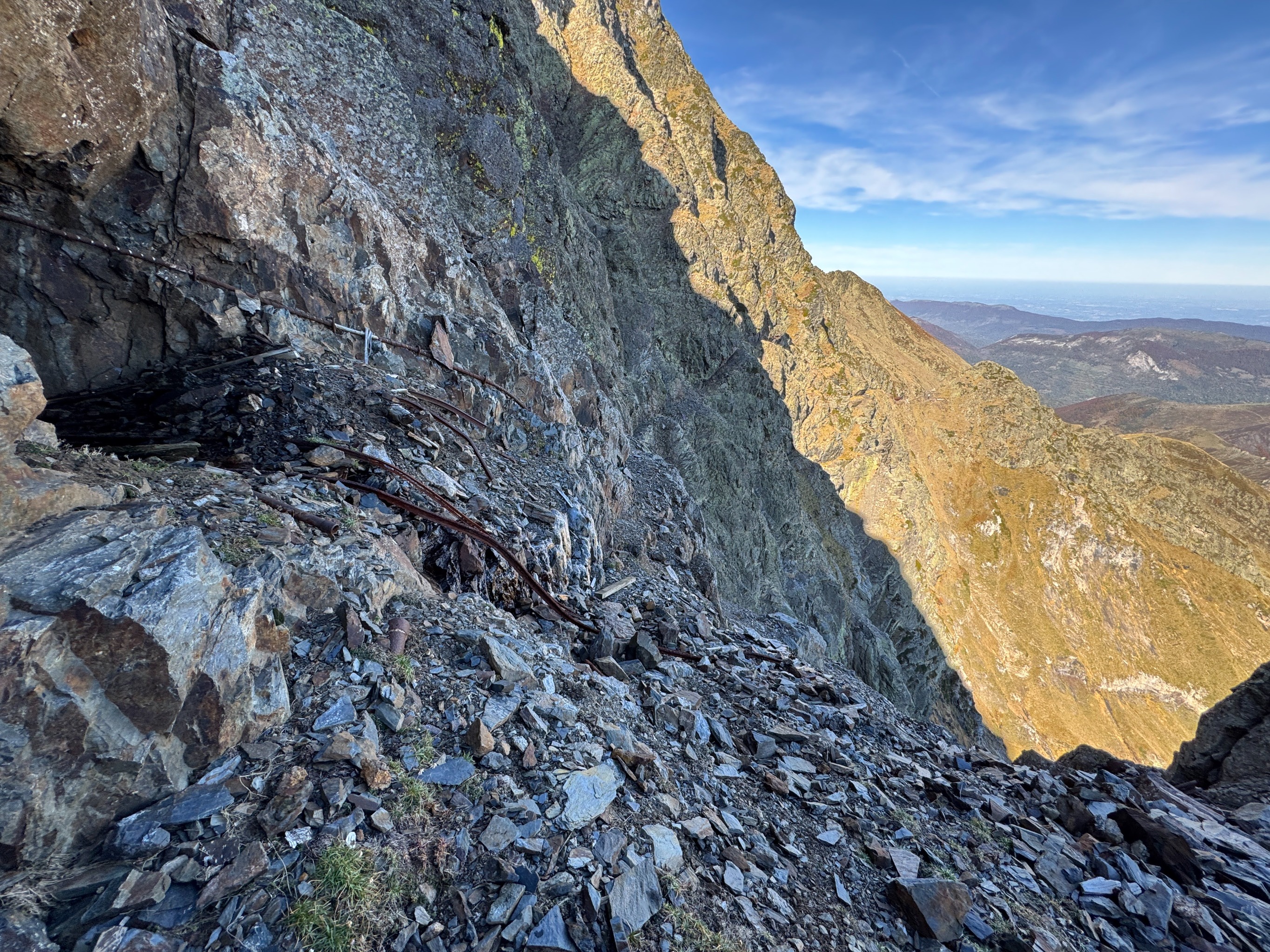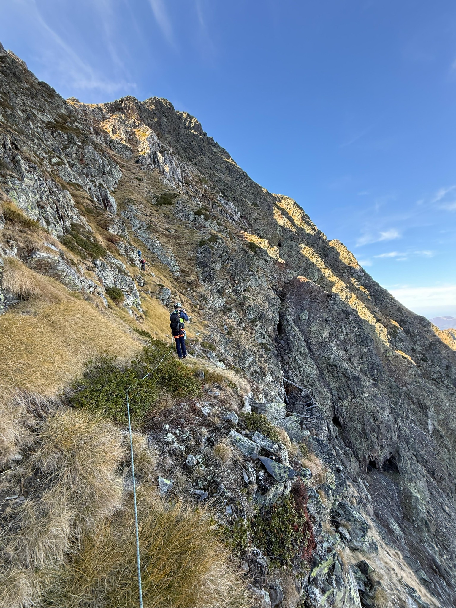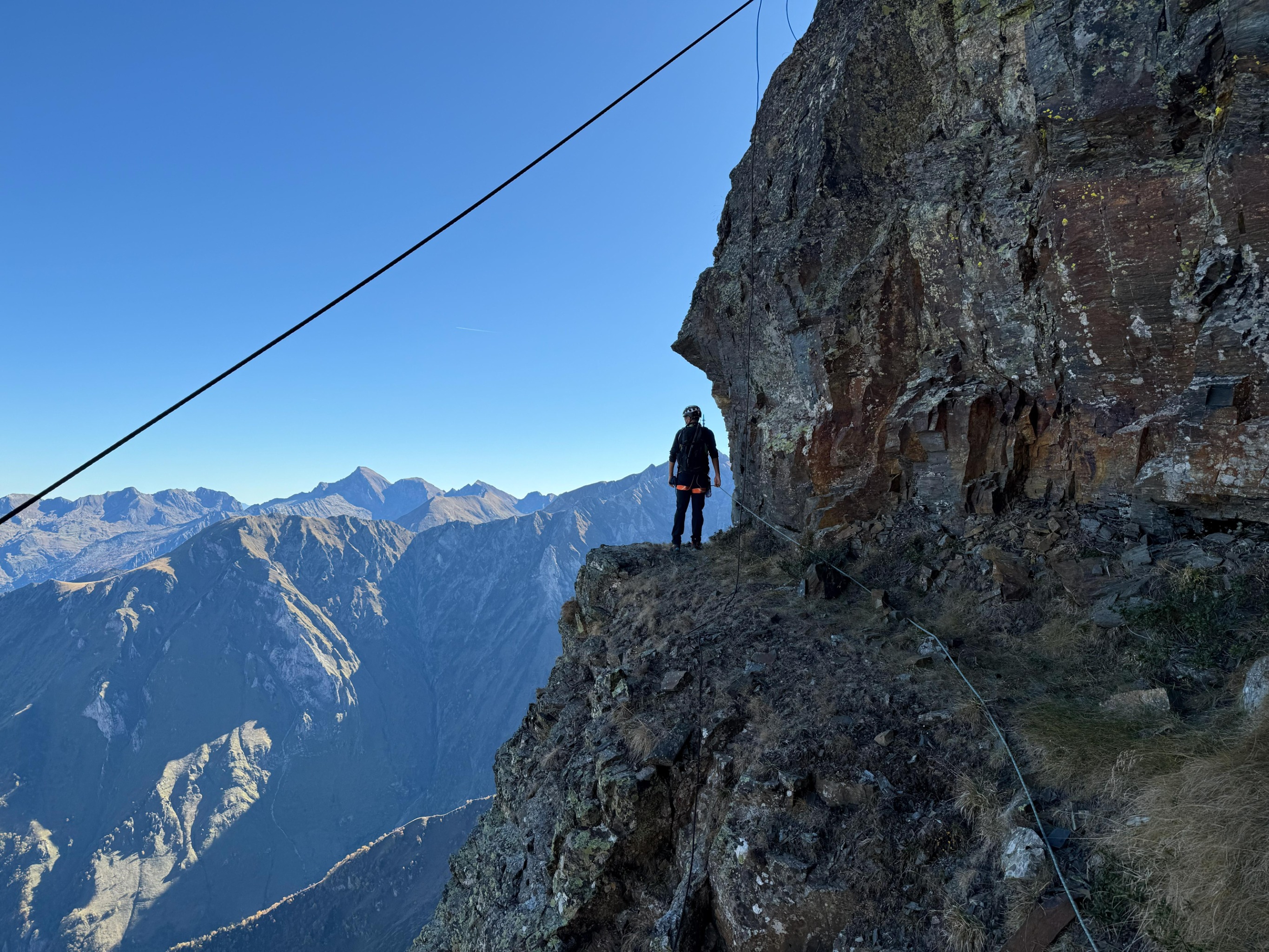 Itinéraire mal ou peu équipé qui nécessite une bonne expérience notamment à la sortie de la voie, dans des pentes herbeuses très exposées et peu protégeables.