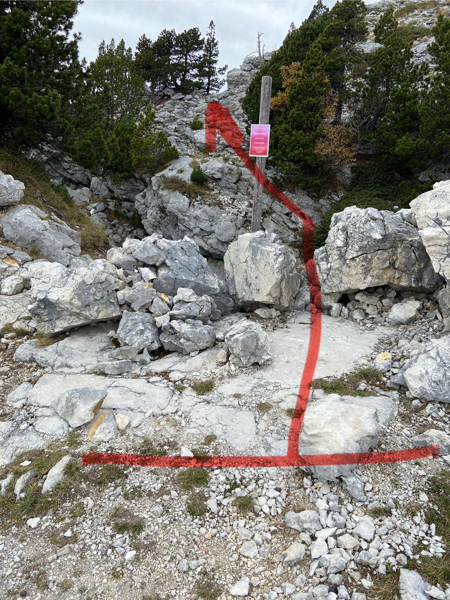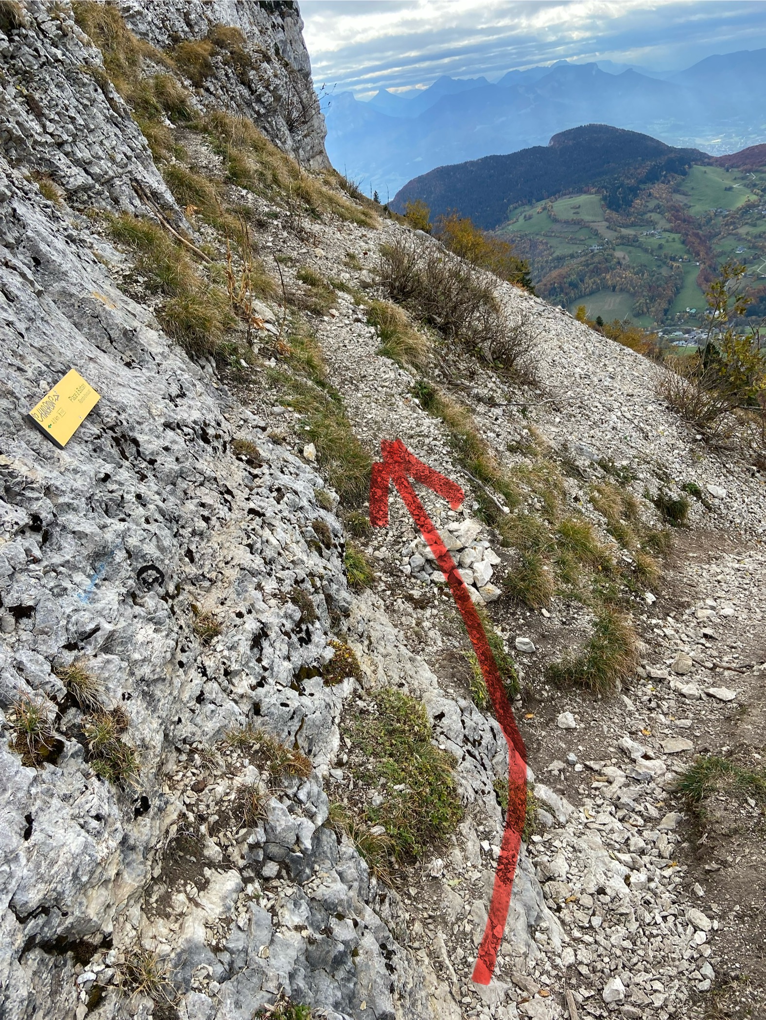 Au poteau indiquant le Golet de l’Agneau, prendre à gauche et suivre le câble continu: d’abord une traversée de 10 m, puis descendre dans la faille (T3).