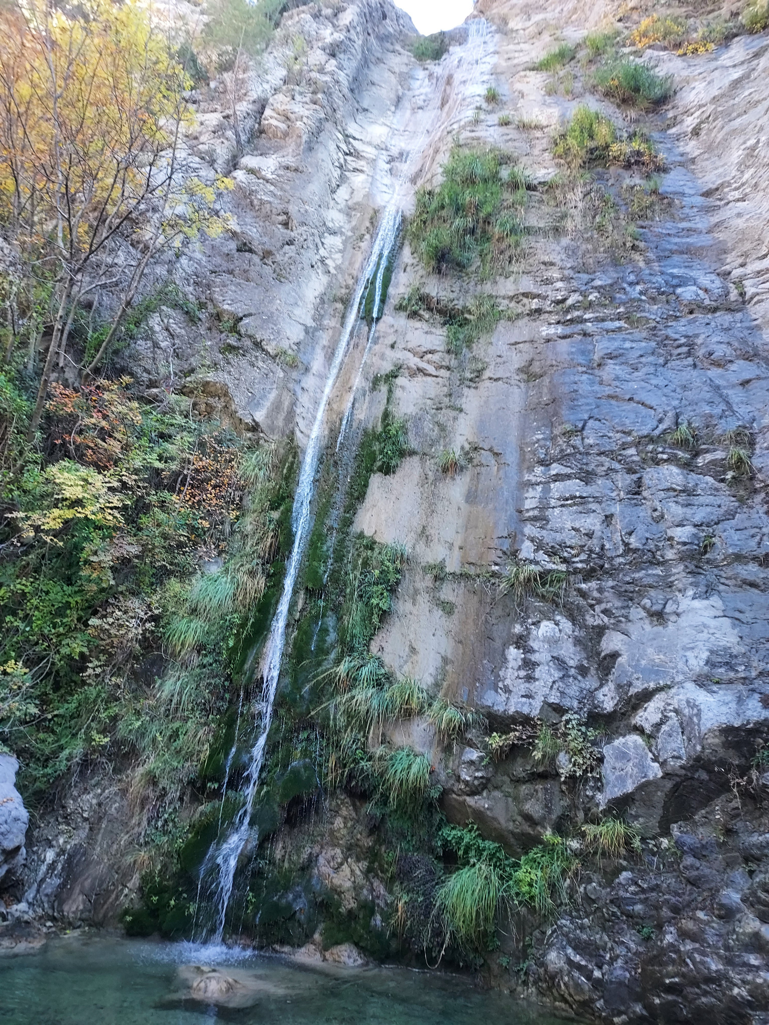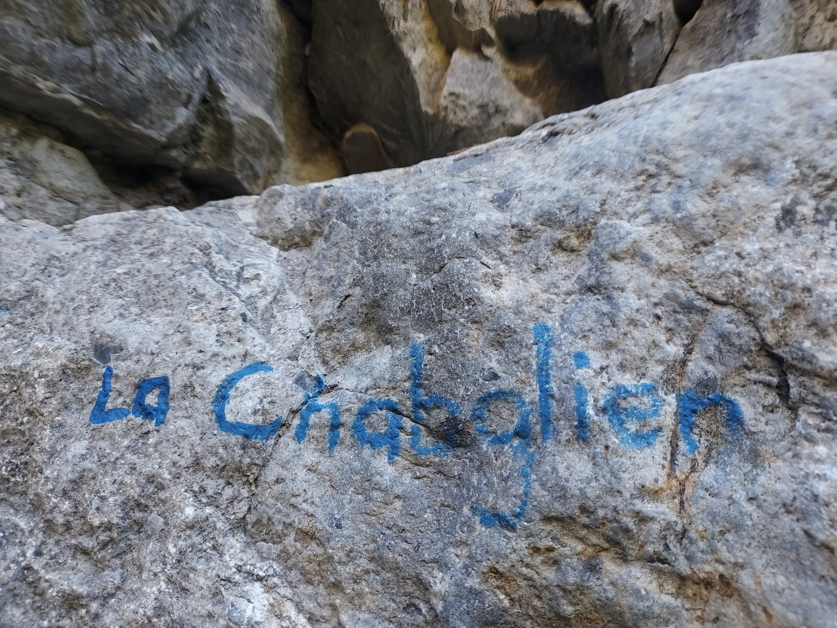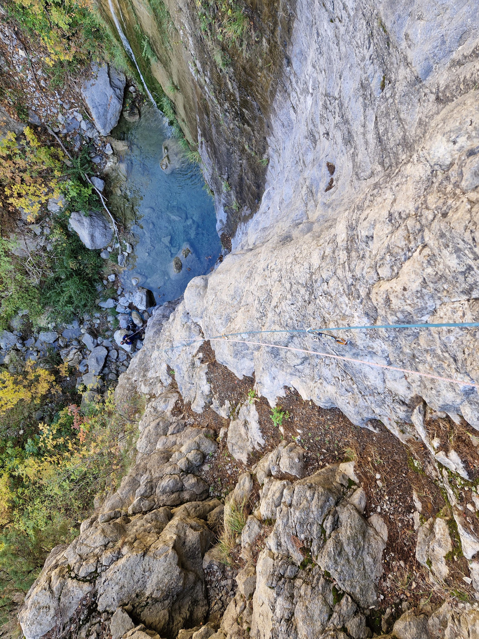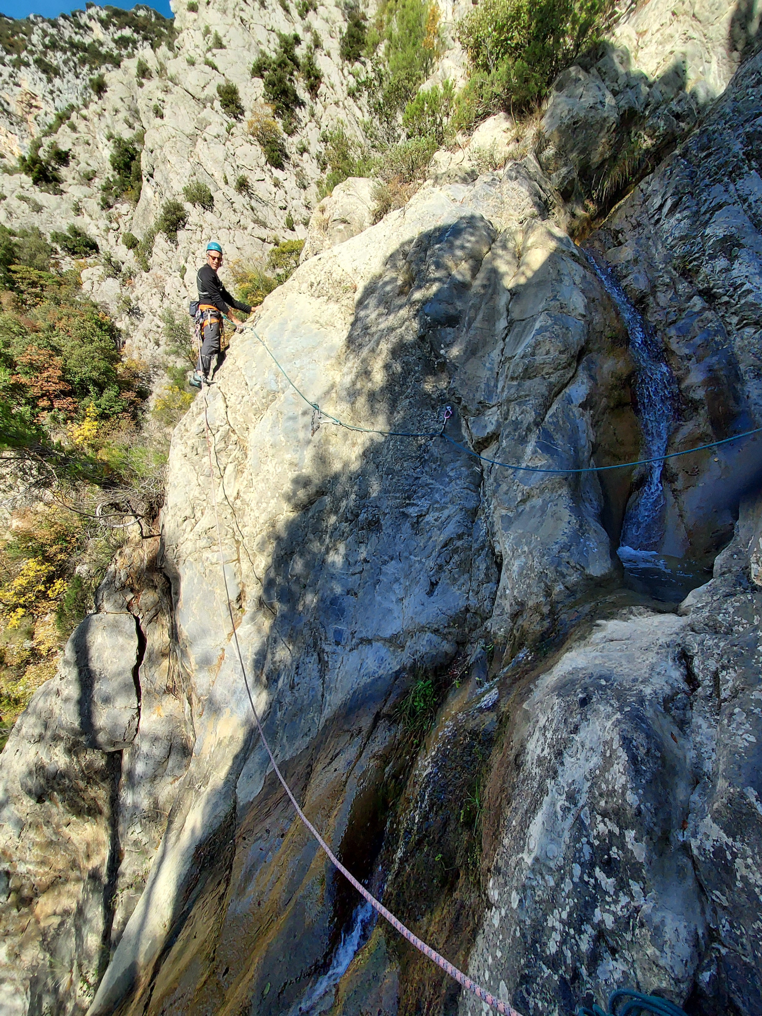 - 3e relais à gauche de la chute d'eau, sens orographique, donc avant d'enjamber le petit canal, il s'agit de deux points à relier, ne pas utiliser le relais de descente du canyon situé rive gauche car il ne tient plus que par un seul point.