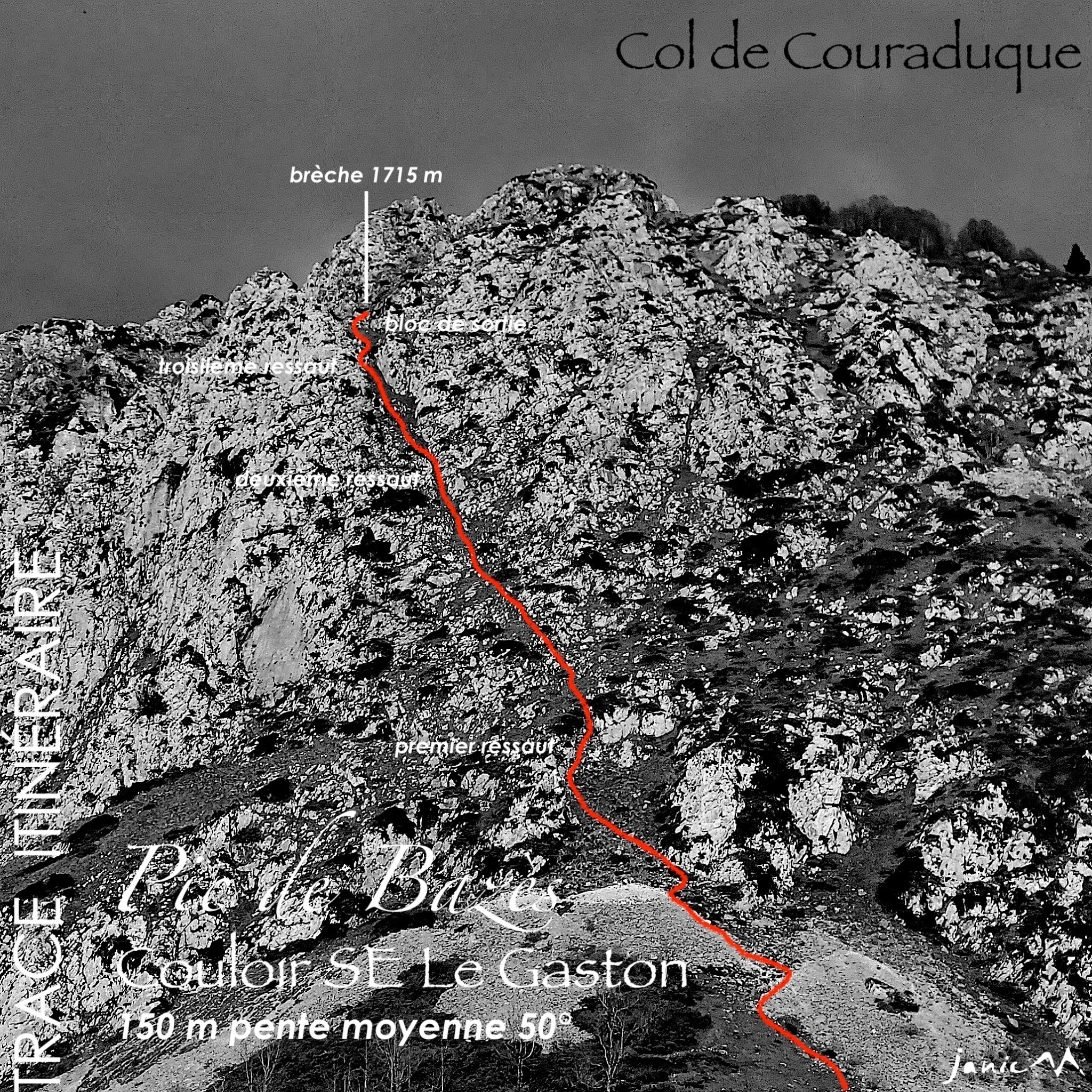 Du col de Couraduque 1367 m même itinéraire que [Pic de Bazès : Y'a pas de Gas'tonton](/routes/1831395/fr/) jusqu'à la raillère qui marque la partie supérieure du cône de déjection. De celle-ci remonter le petit cirque herbeux qui la domine puis prendre dans l'axe le ressaut aux rochers affleurant (55°), en suivant la rampe à la pente régulière jusqu'au premier resserrement, qui marque un ressaut (55°/60°) en sortir par la gauche, le couloir se prolonge avec une pente constante, un troisième ressaut se présente (60°), il se négocie par le rocher main gauche (pas de 2) puis traversée pour revenir dans l'axe de la pente qui marque la fin du couloir, il reste un dernier ressaut rocheux de 3 m (2/3) pour atteindre la brèche 1715 m.