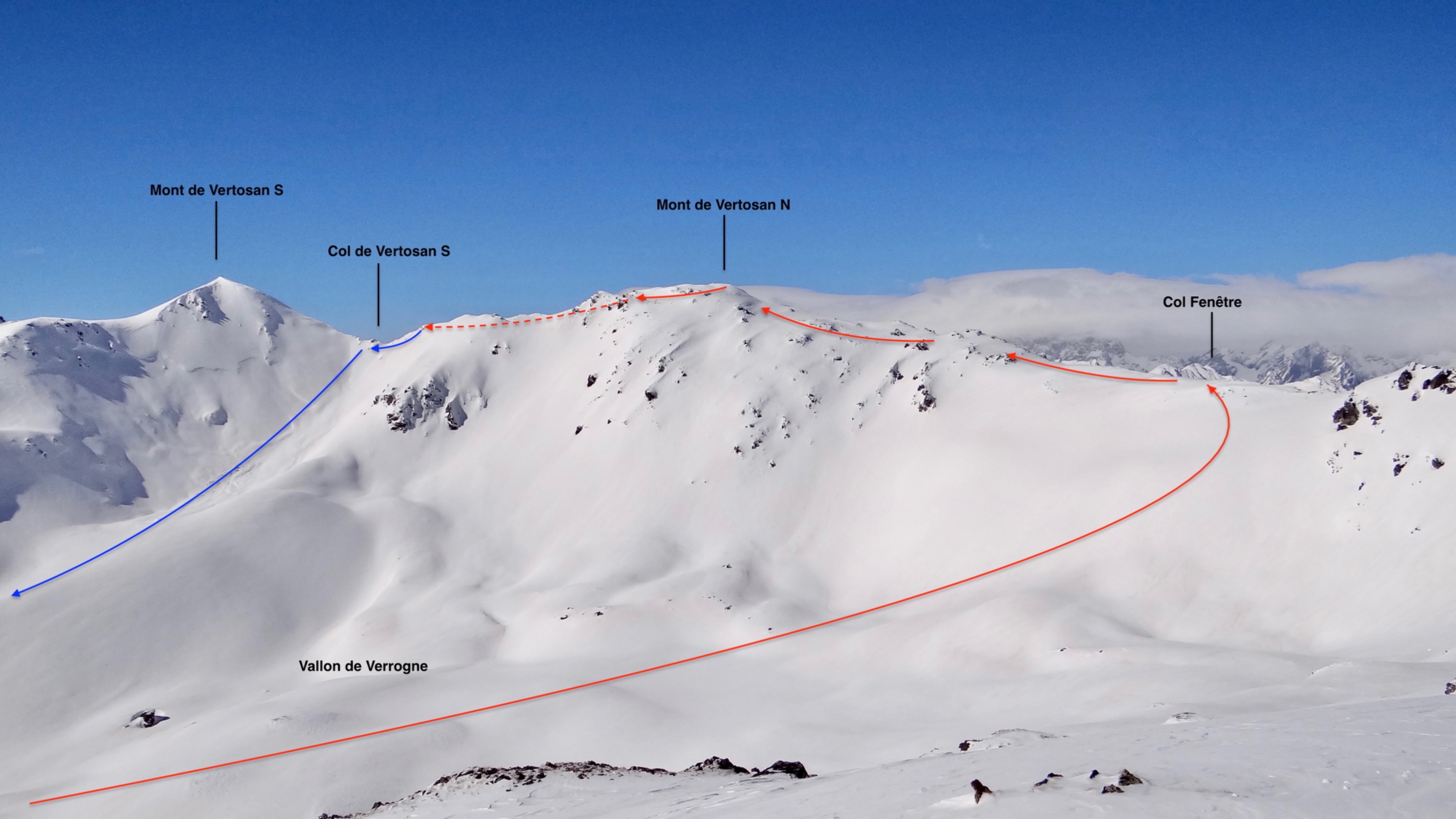 Du sommet du mont de Vertosan rejoindre par une traversée le col de Vertosan S à 2768 m. L'itinéraire du sommet au col s'effectue par une crête assez large, souvent soufflée, avec 3 seuils rocheux facilement franchissables. Attention aux éventuelles corniches.