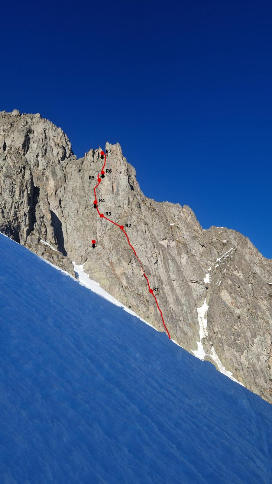 L# | M6 (4 spit)| 45-50 m| Dièdre raide au départ (crux, 1 spit) puis le dièdre fissuré s'ouvre dans un terrain alpin (M5+).