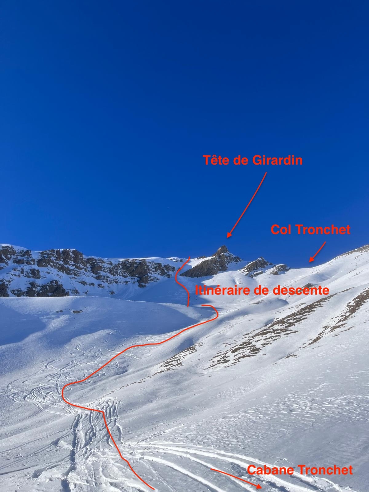 La descente est exposée S et peut donc facilement présenter un manque de neige
