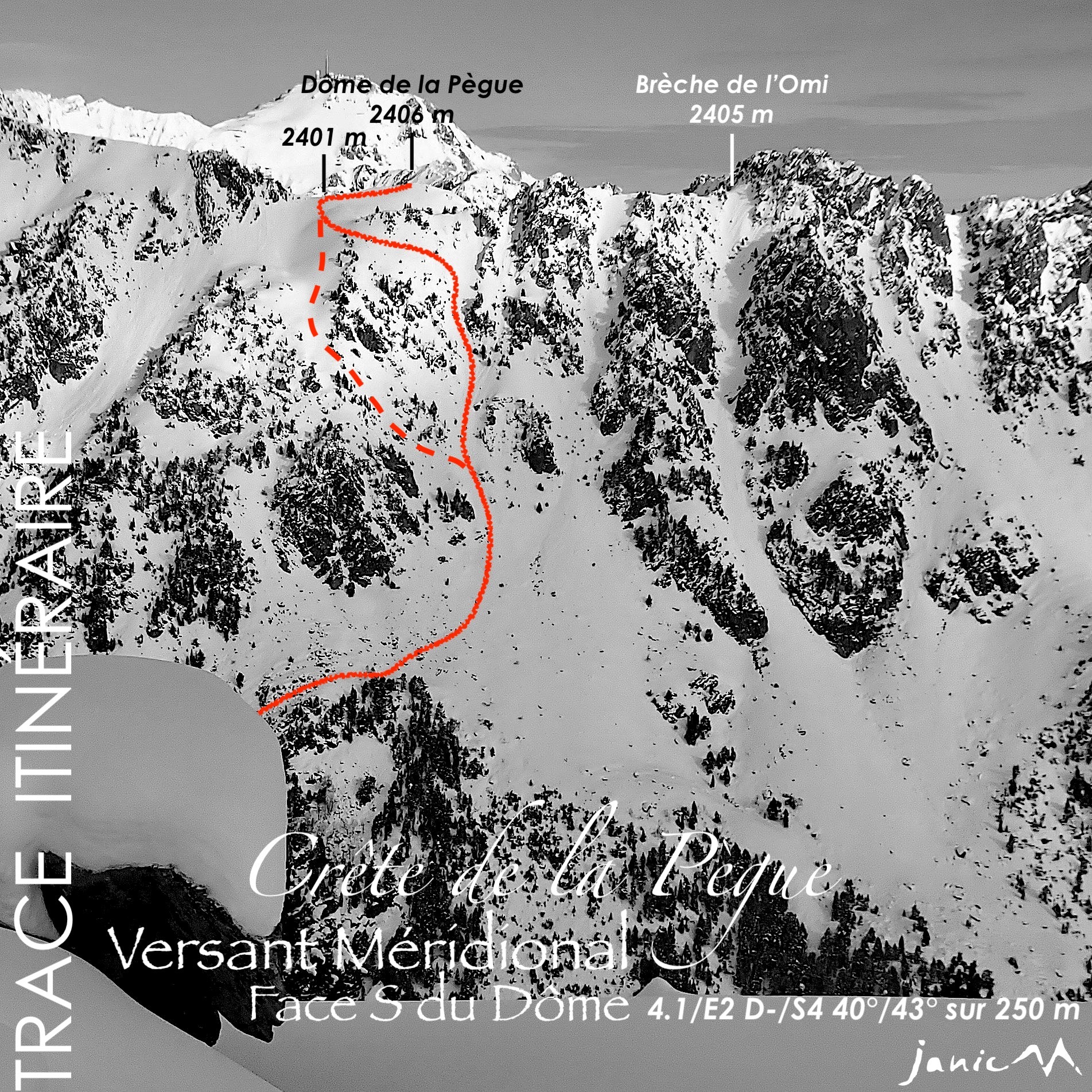 Du dôme descente à la large dépression (col), puis basculer versant S en traversé descendante gauche (pente à 45°) pour rejoindre l'axe général, puis direct dans la pente sur 200 m (40°/44°), au sortir des blocs rocheux environnants dans la pente inférieure partir en traversé descendante (Passade de la Pègue) pour rejoindre à 1740 m le vallon d'Ets Coubous et retour classique à Tournaboup.