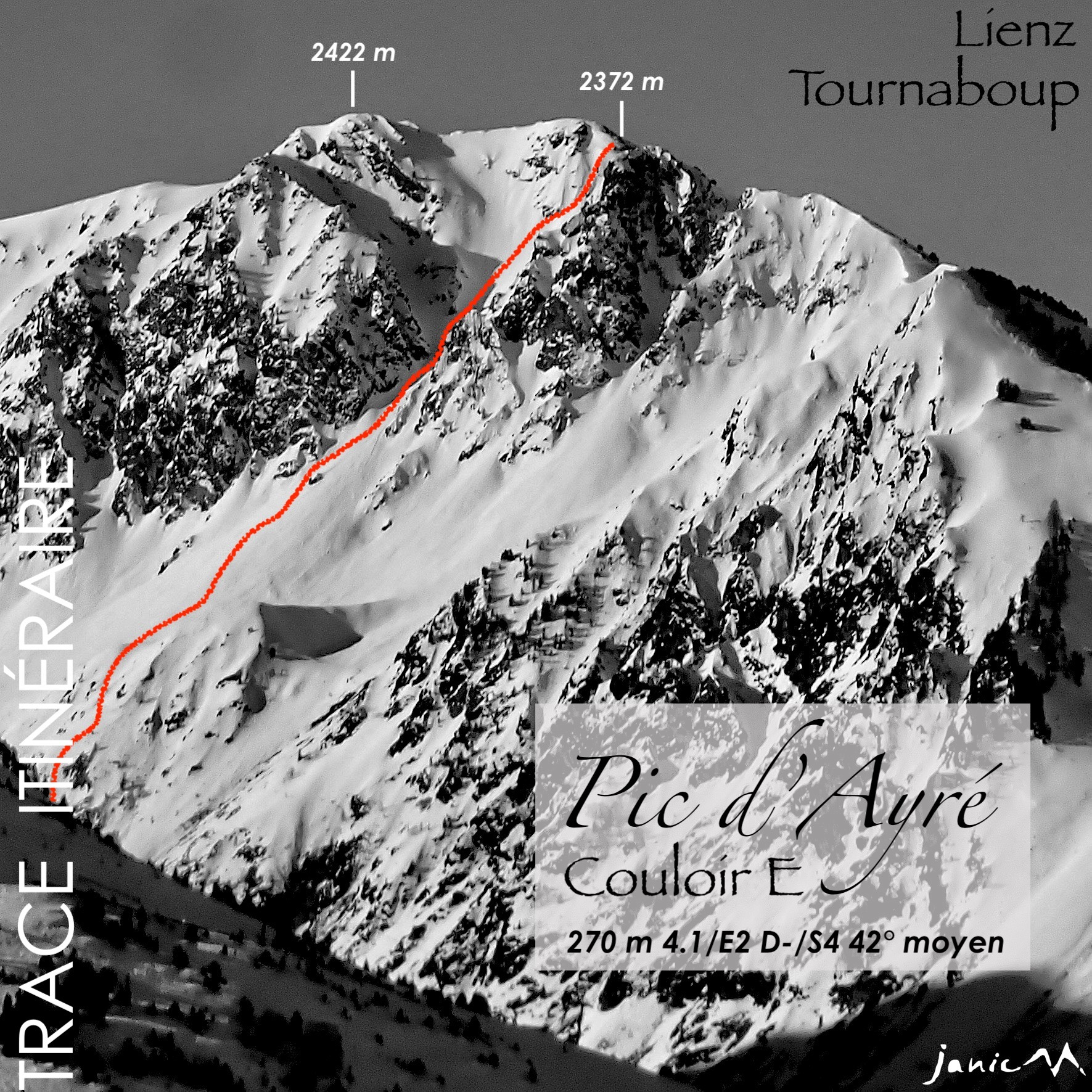 Selon le point de départ : Barèges, Pont de Tratet ou Tournaboup, pour atteindre le Lienz, puis suivre la piste de la vallée de la Glère jusqu'à 1600 m non loin du deuxième pylône de la ligne HT, de là monter SW les pentes du versant avec en point de mire le dôme 2053 m que l'on contourne par le S pour atteindre le replat attenant, le couloir est évident plein W, remonter le cône de déjection, passer le premier rocher isolé puis continuer en direction de l'îlot rocheux, prendre la branche de droite puis au-dessus soit se diriger vers le col 2372 m ou tirer à gauche pour déboucher au Pic de l'Ayré 2422 m.