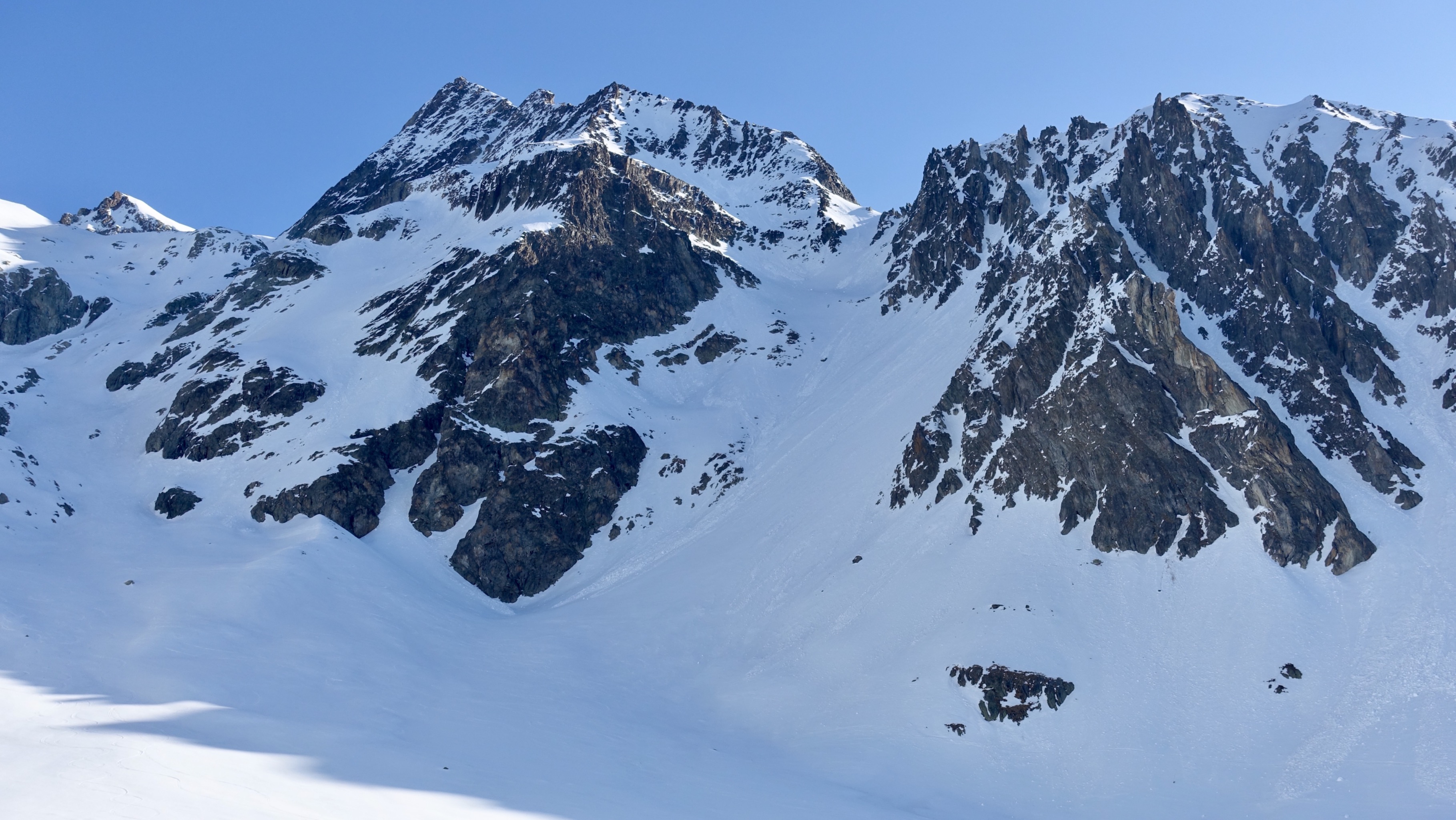 Après la première partie à 35° environ le couloir devient plus étroit mais permet toujours de bonnes traversées pour sa remontée à ski, passages à 40° à la moitié et pour sa partie finale. Il reste toujours bien pentu sur toute sa longueur.