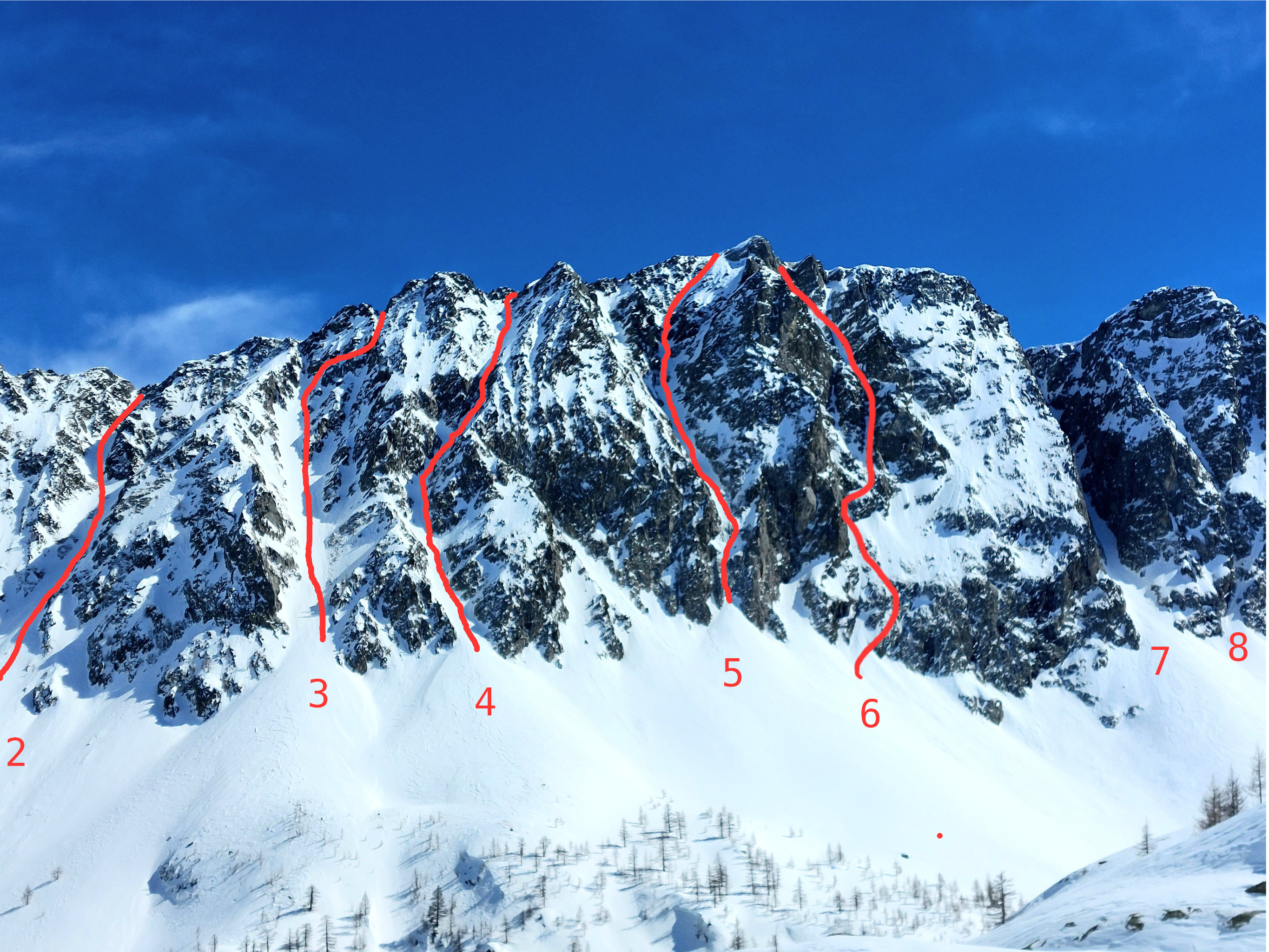 L#2 | WI3 | | | Remonter un petit mur de glace à 65/70° puis une nouvelle pente de neige à 50. R#2 sur pitons au pied de la goulotte