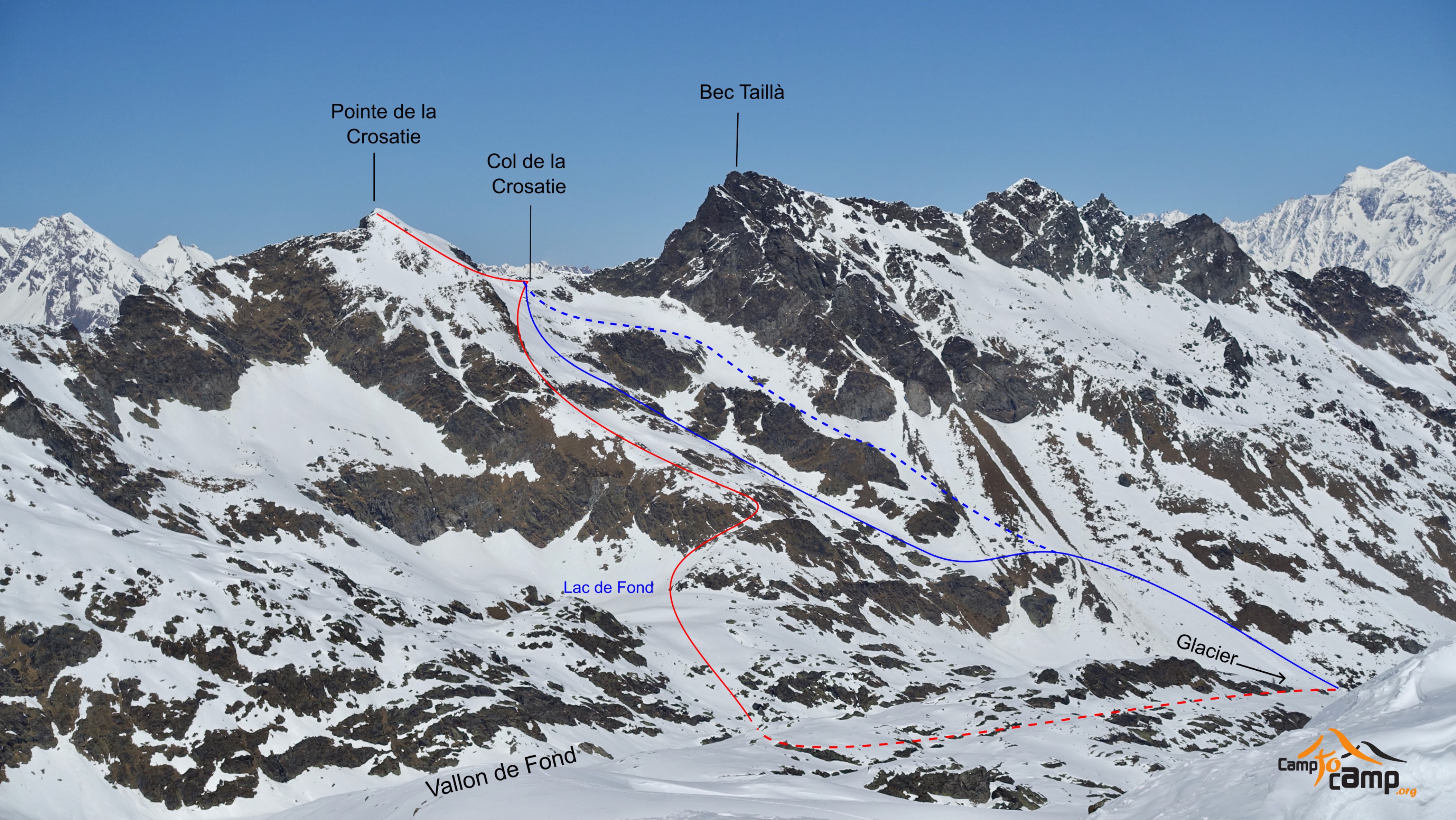 - Il est possible au niveau de l'alpage de Glacier de monter au col de la Crosatie en suivant l'itinéraire indiqué de descente (en bleu sur la topo photo) après avoir repéré l'enneigement qui peut être très changeant d'une période à l'autre de l'hiver.