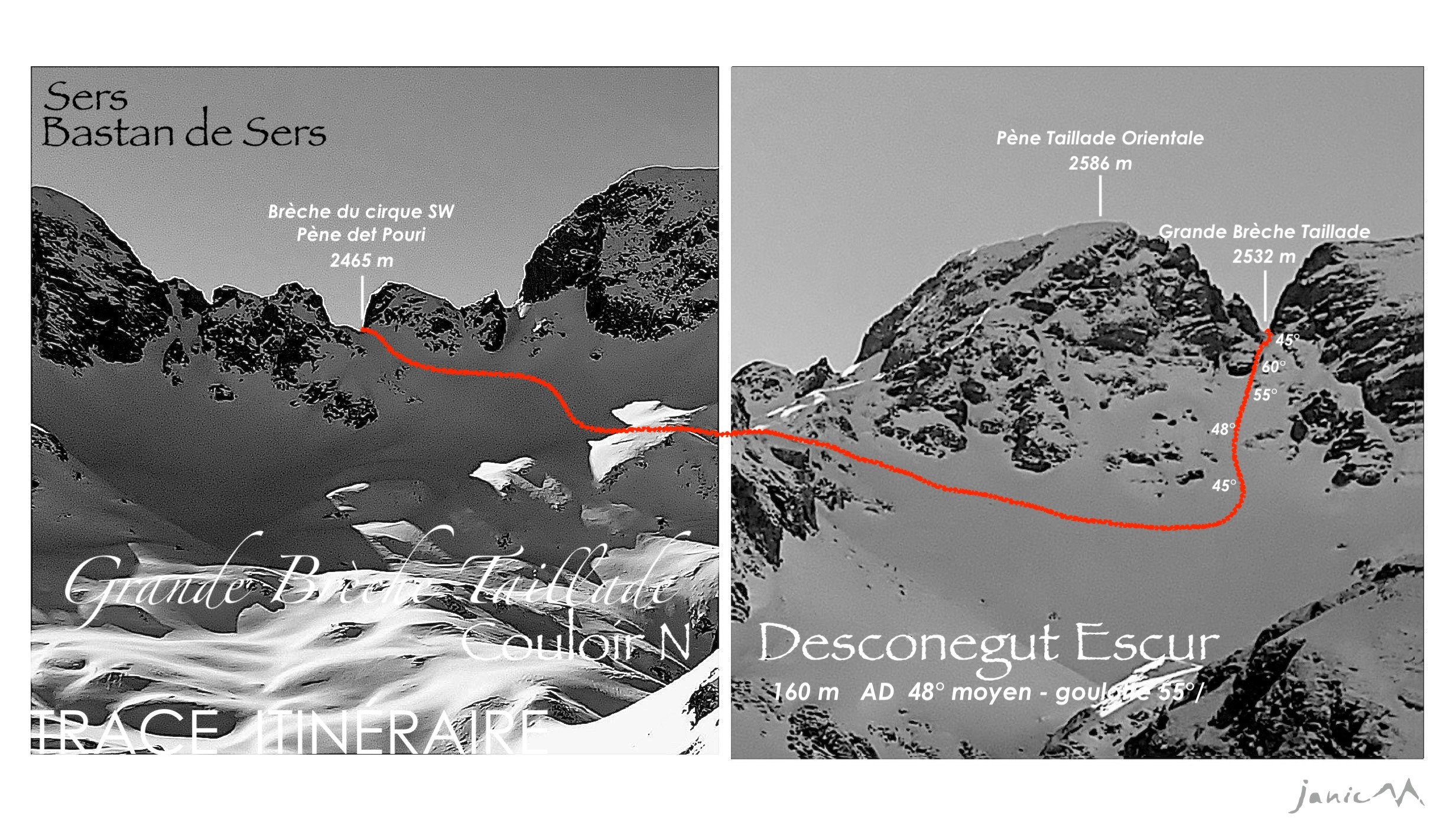 De Sers 1140 m le sentier qui amène au terminus du vallon de Bastan de Sers 1430 m, si la piste est dépourvue de neige il est possible d'atteindre l'aire de retournement. De 1430 m, suivre l'itinéraire [[routes/1041078|Pène Taillade : Pointe Orientale 2588 m - Versant S]] jusqu'à la cuvette SW 2314 m du Pène det Pouri, rejoindre la brèche évidente 2465 m sur la crête dentelée située entre Pène Taillade Orientale et Pène det Pouri.