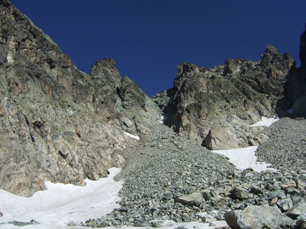 Atteindre la combe au pied du versant N des Grandes Aiguilles de l'Argentière. La remonter au mieux jusqu'à la Brèche de l'Argentière.