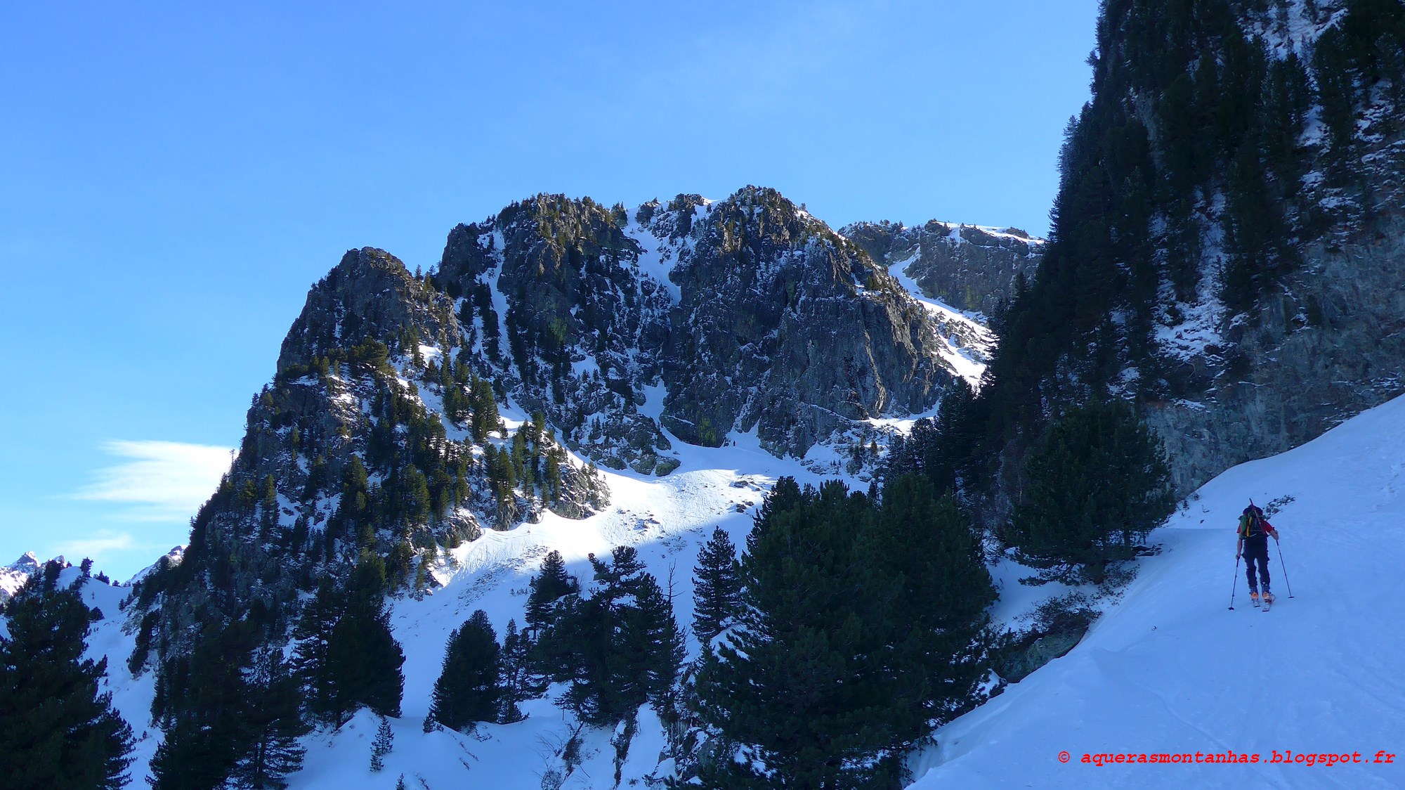 Suivre le fil de l'éperon en zigzaguant au plus facile dans les pins. À mi-parcours, on arrive sur une longueur qui peut être en glace (plus systématique) qui peut aussi se contourner par la droite.