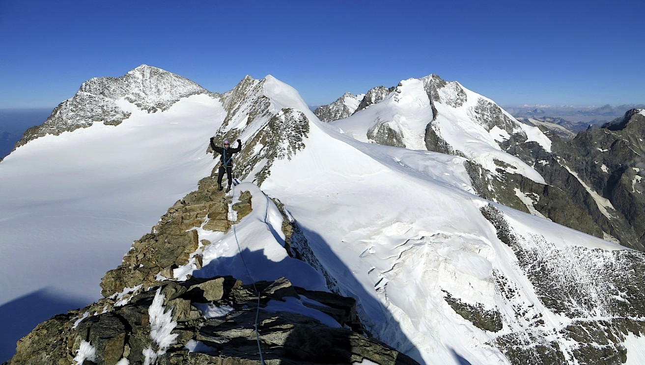 Depuis le col, suivre une arête rocheuse/mixte peu difficile jusqu'au Piz Spinas (3823) et poursuivre par une arête mixte jusqu'au dôme neigeux du sommet central (3900). Une arête aérienne permet de rejoindre le sommet oriental (3882).