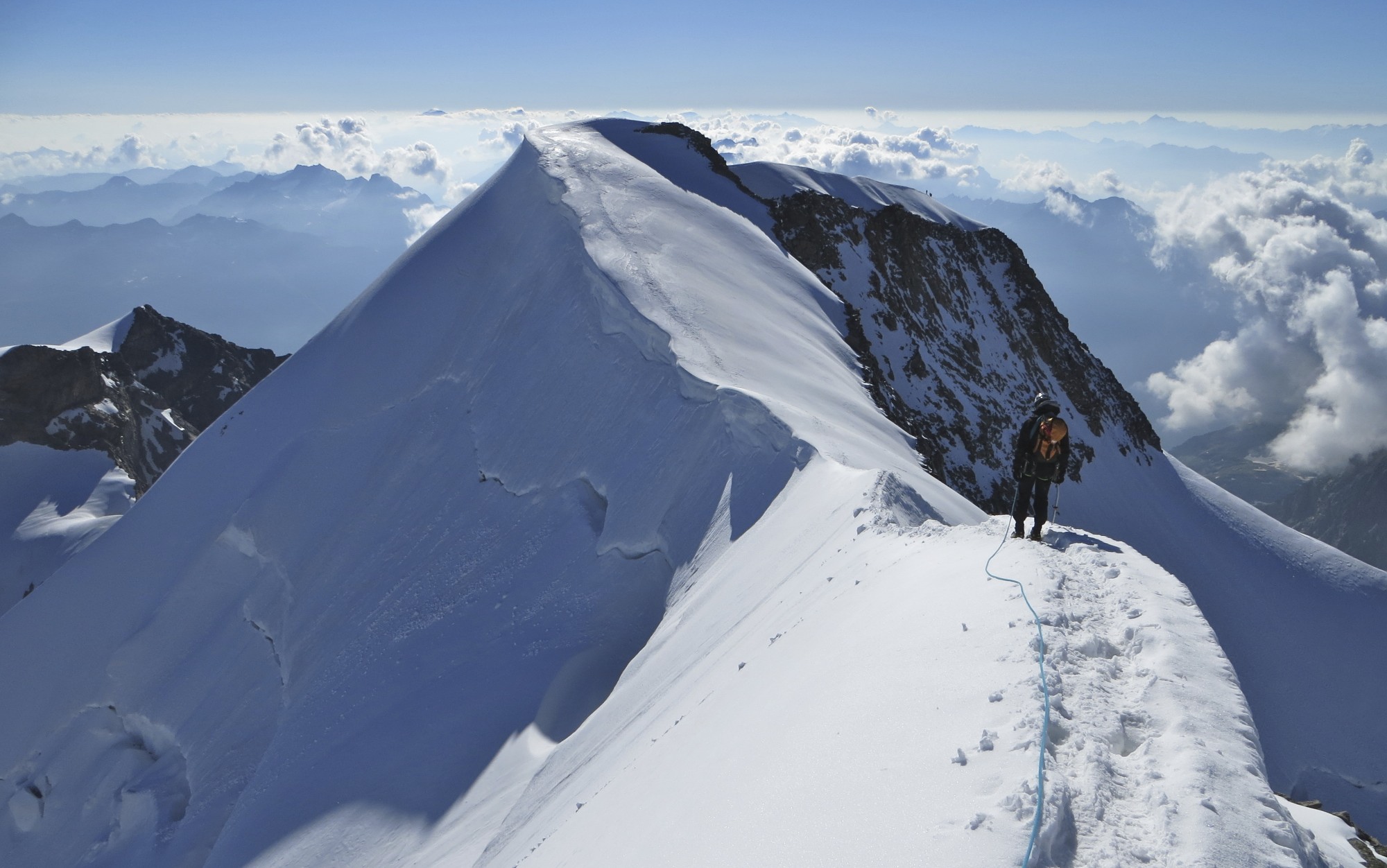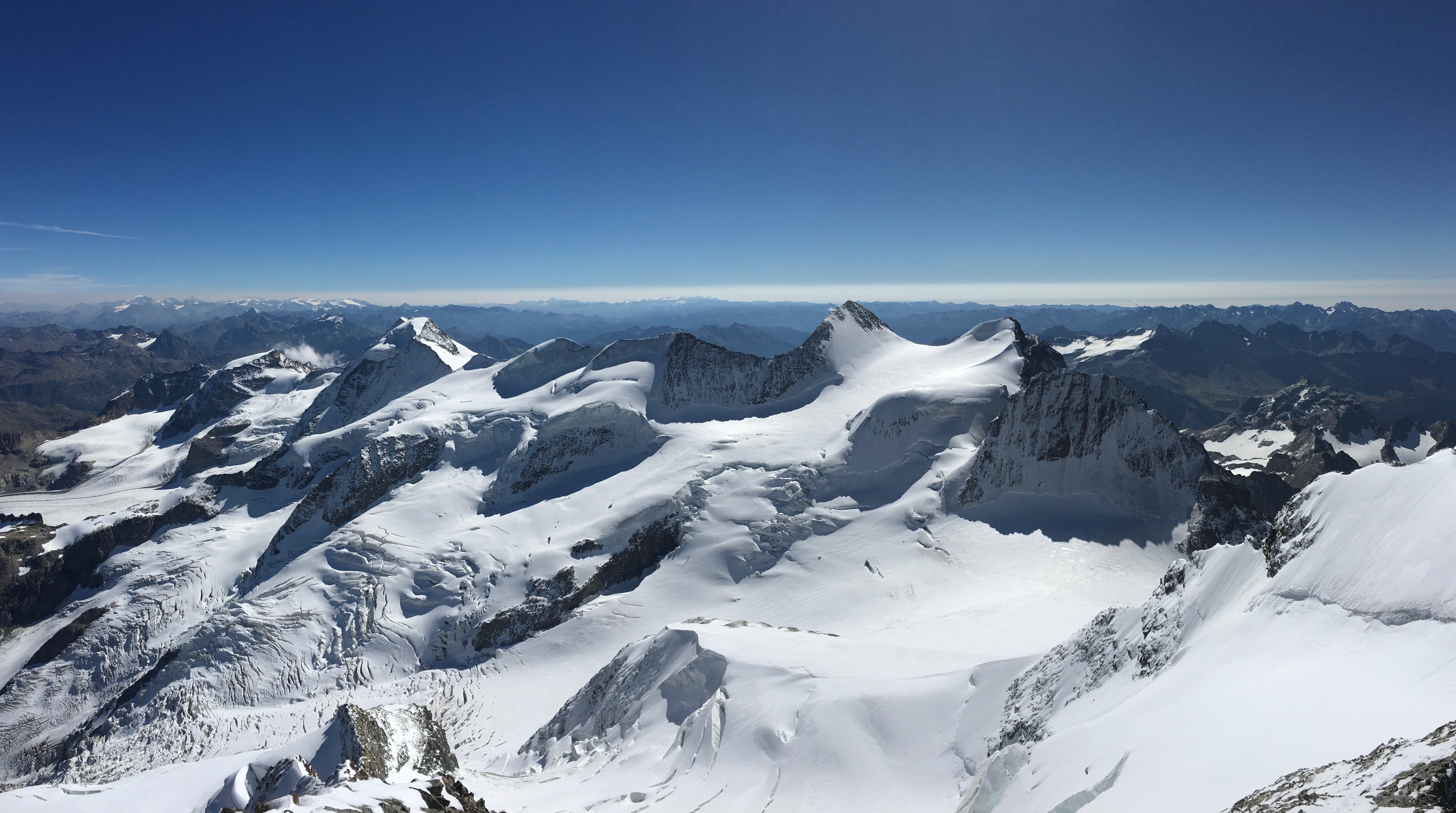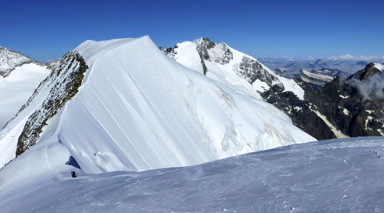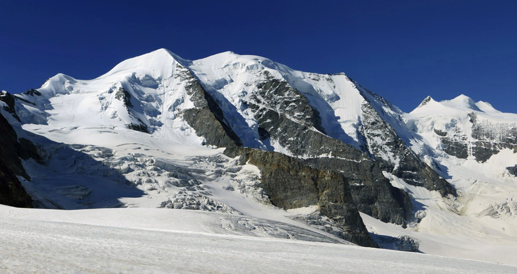 Depuis le refuge Marco e Rosa, rejoindre par une grande traversée descendante au début suivant l'état du glacier, le col de la Fuorcla Bellavista (3688), en passant sous les gros séracs de Bellavista.