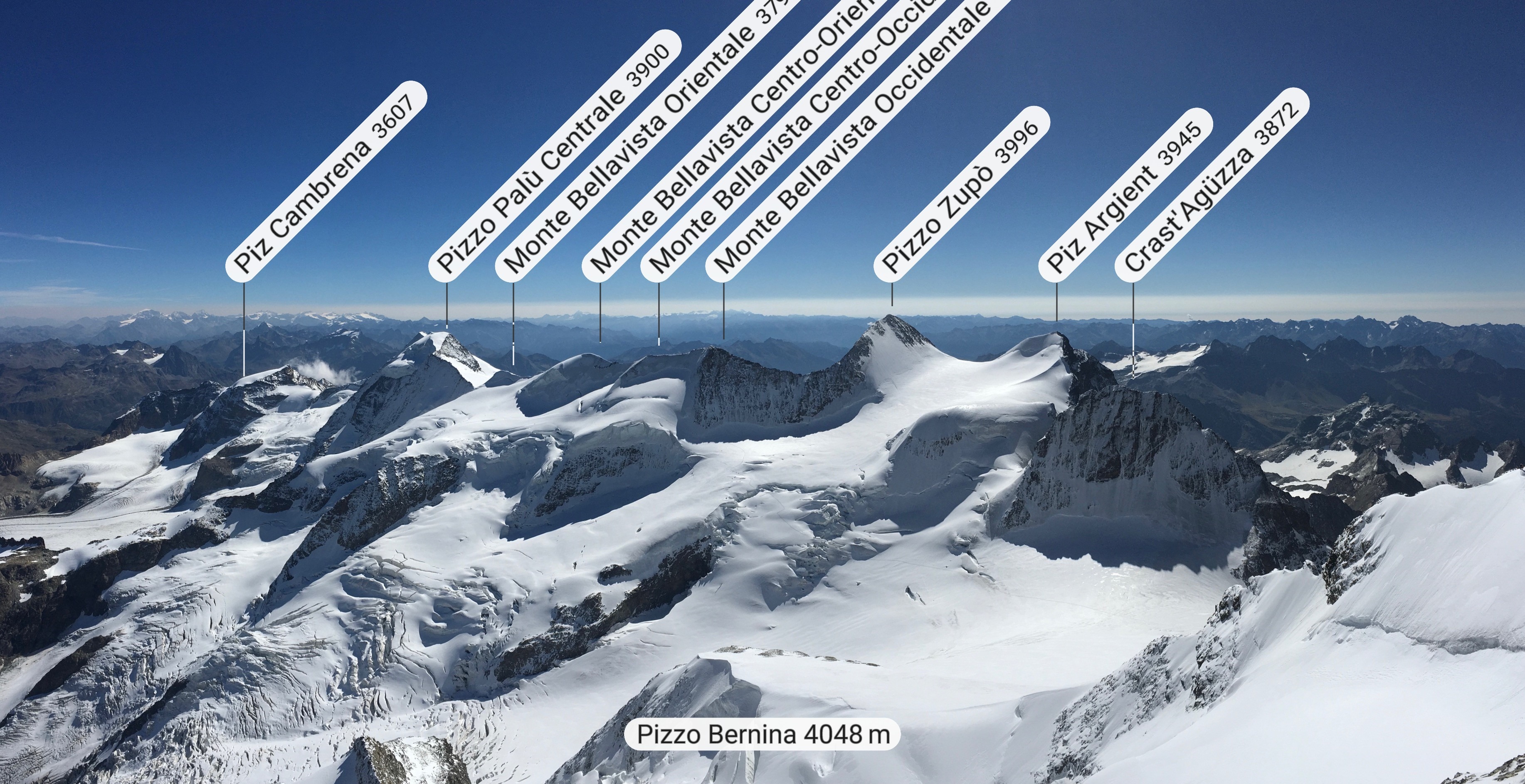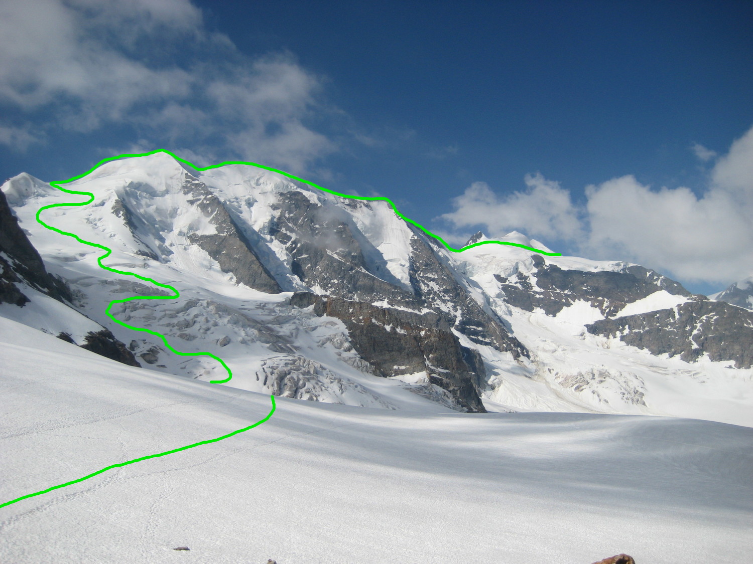 Poursuivre vers l'E par une arête de neige esthétique et aérienne jusqu'à un col à environ 3750. Bifurquer au N et descendre le Vadret Pers en contournant des zones de grosses crevasses. Vers 3000 remonter un peu vers le N pour atteindre la Fuorcla Trovat. Un sentier en versant NE amène alors à la Diavolezza (cabane/téléphérique).