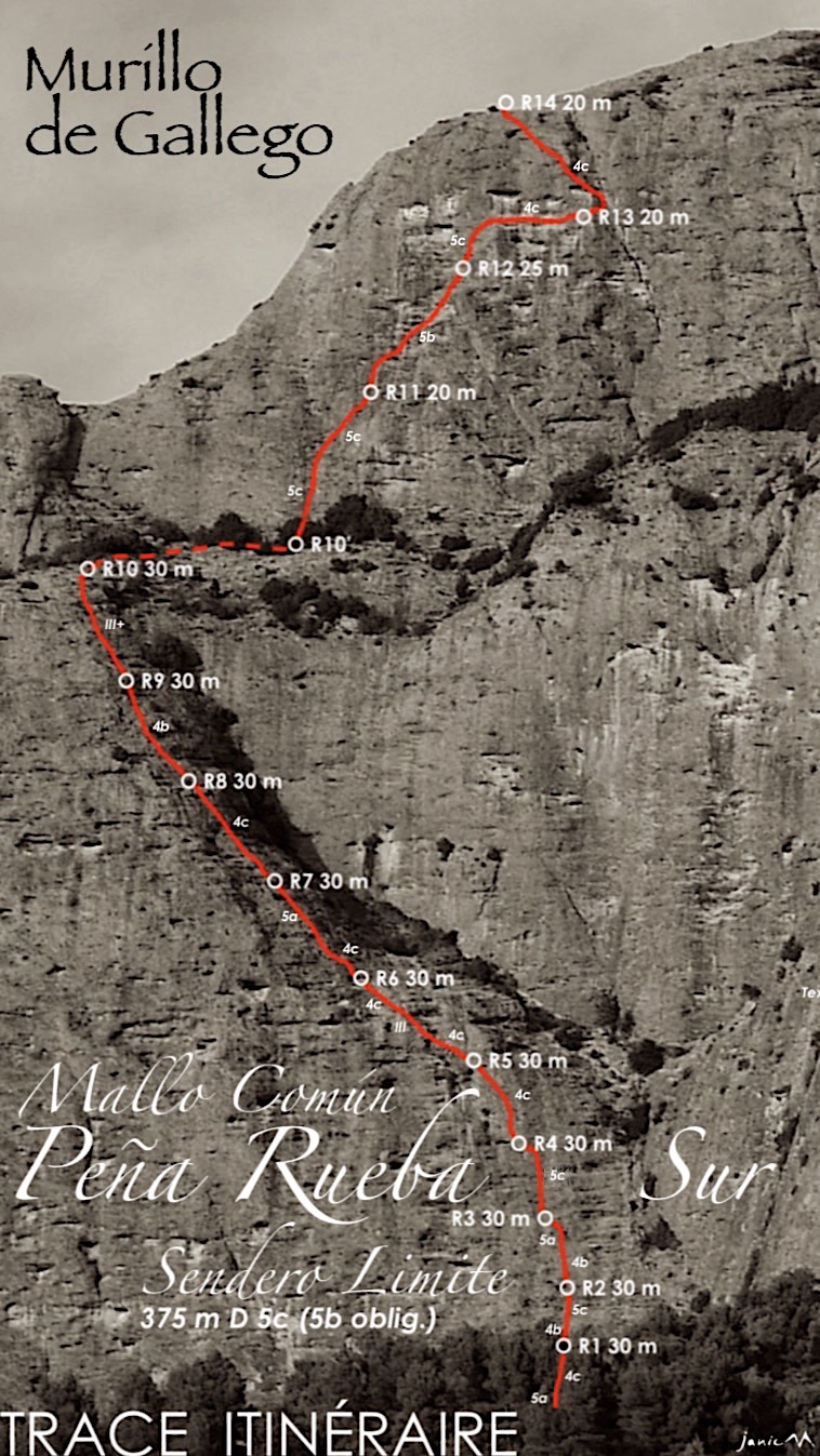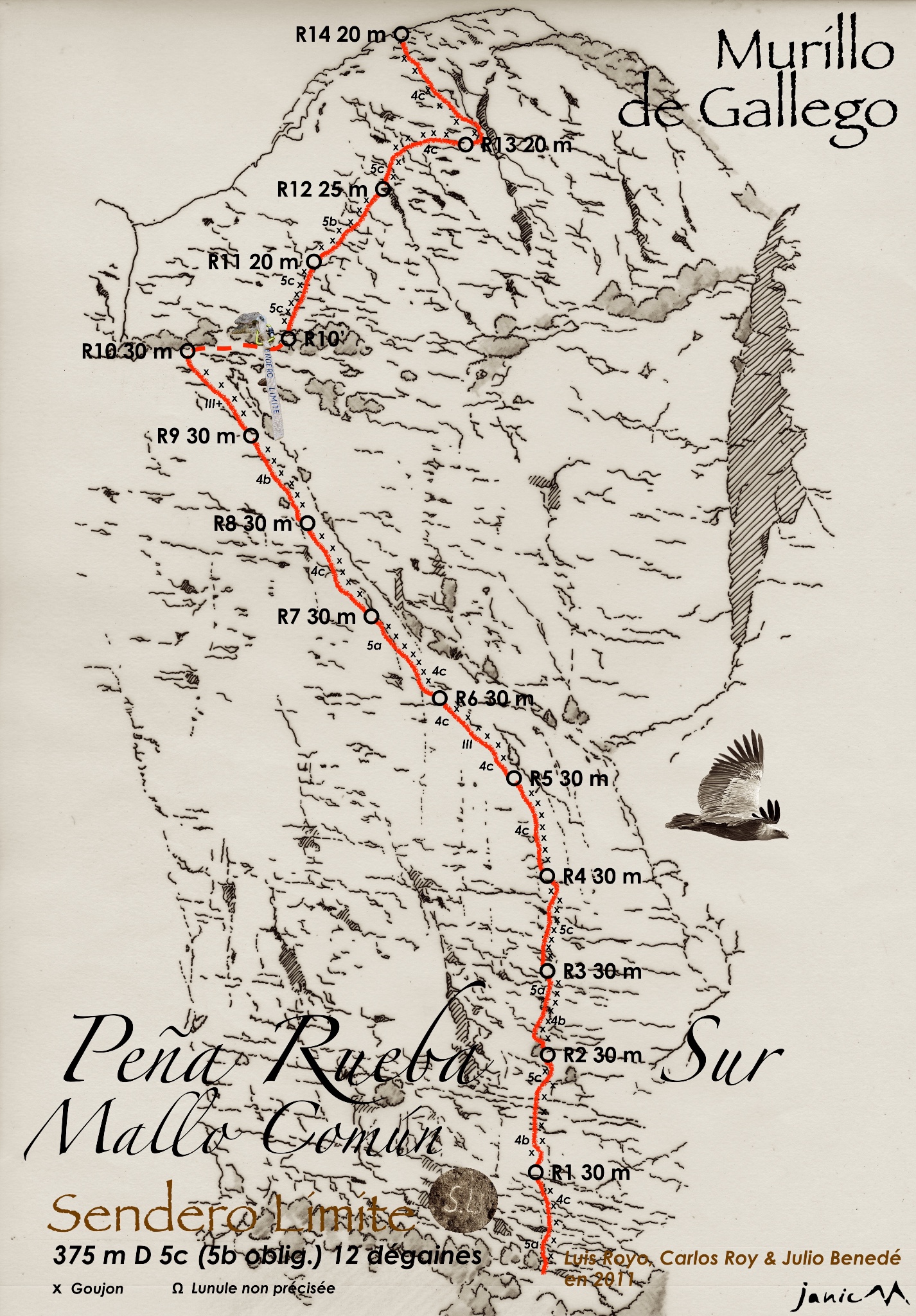 L# | 5b | 20 m | Monter en ascendance à droite un éperon à peine marqué. R# au pied d'un ressaut très raide, commun avec [[routes/645950|Lorenzo Ortas]].