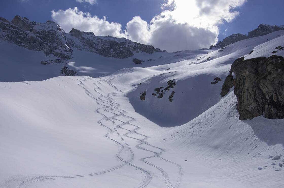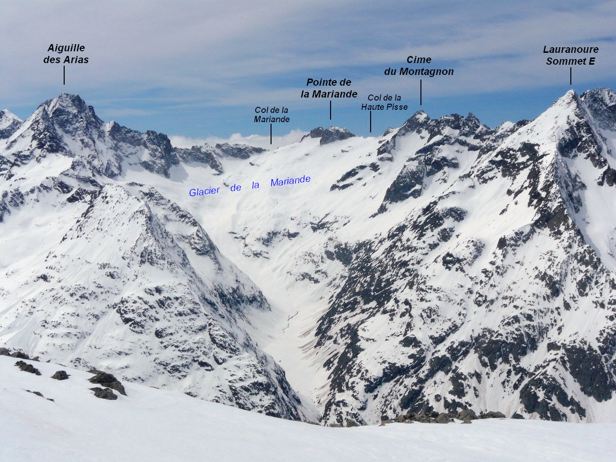 Rejoindre ainsi la Gassaudière (1614 m), et traverser les ruines à l'horizontale par le N pour rester sur le sentier d'été. Descente pour traverser le torrent de la Mariande et remonter les pentes E jusqu'à rejoindre l'itinéraire venant du refuge de l'Alpe du Pin. Le fond du torrent de la Mariande, très encaissé est impraticable à ski (sauf enneigement exceptionnel peut-être!). On surmonte le verrou par le chemin d'été, coulée d'avalanche et on redescend sur le grand plat (1915 m). La suite est évidente, par un mouvement tournant de la gauche vers la droite, on contourne les barres et on s'élève dans le cirque au choix.