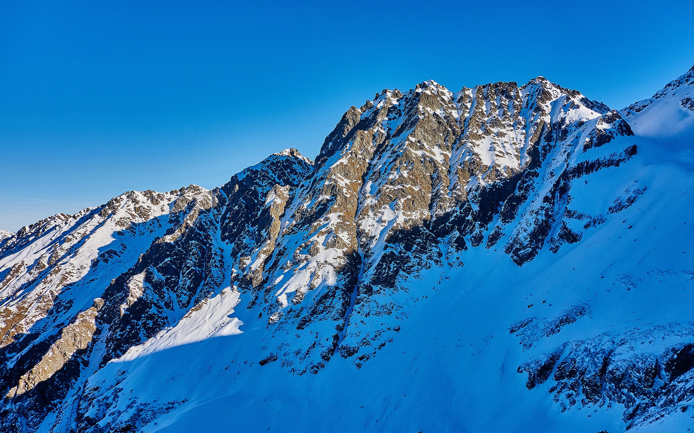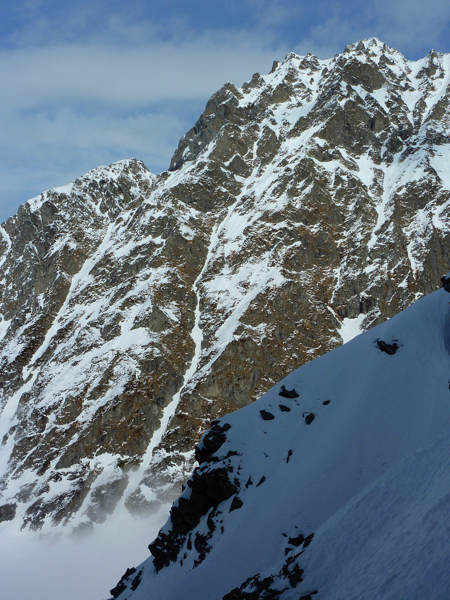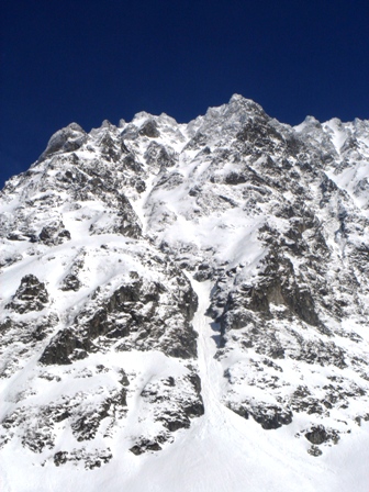 Remonter le couloir. En cas de faible enneigement, il présente 2 ressauts plus raides, bouchons de neige, étroitures mixte ou glace.