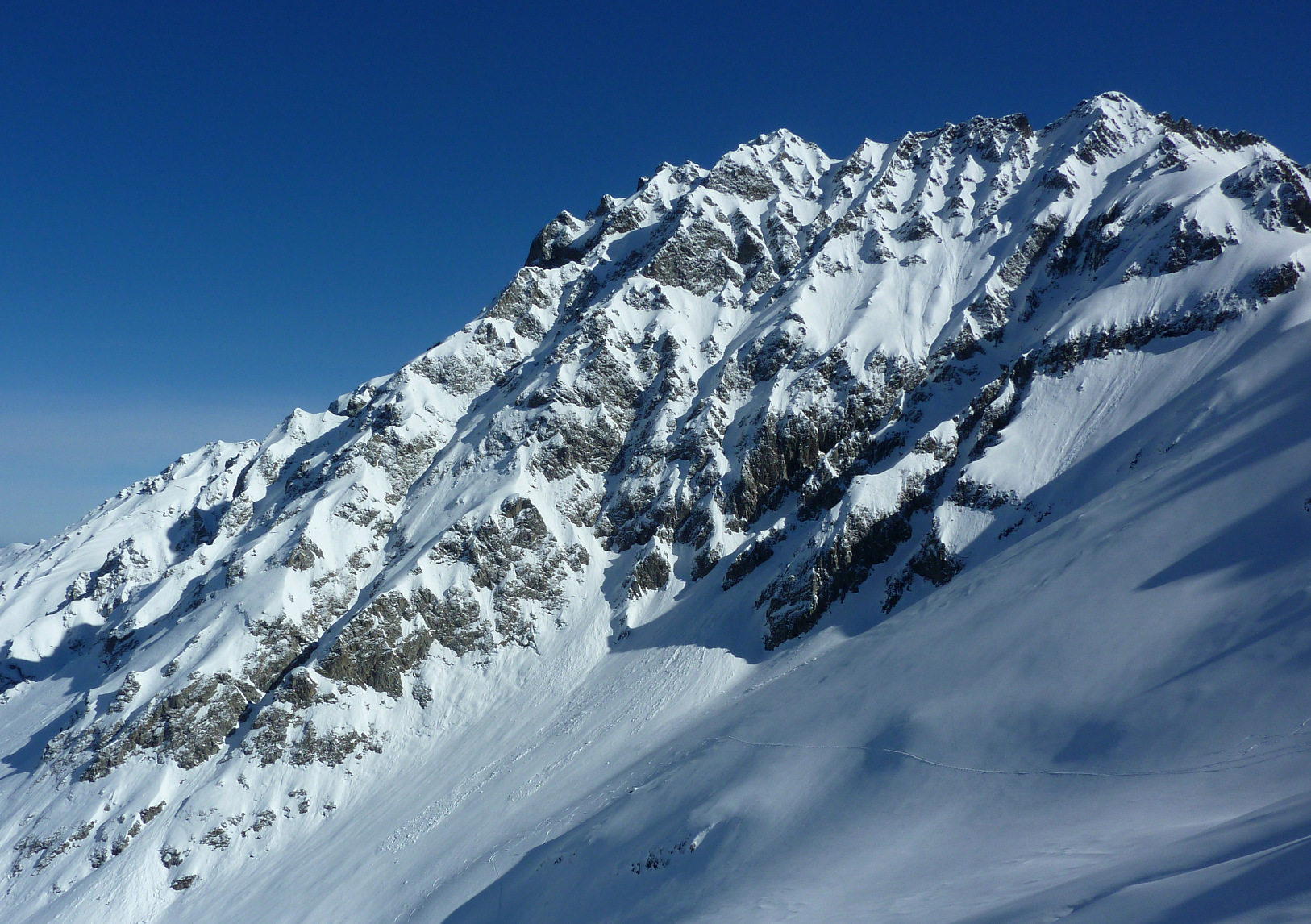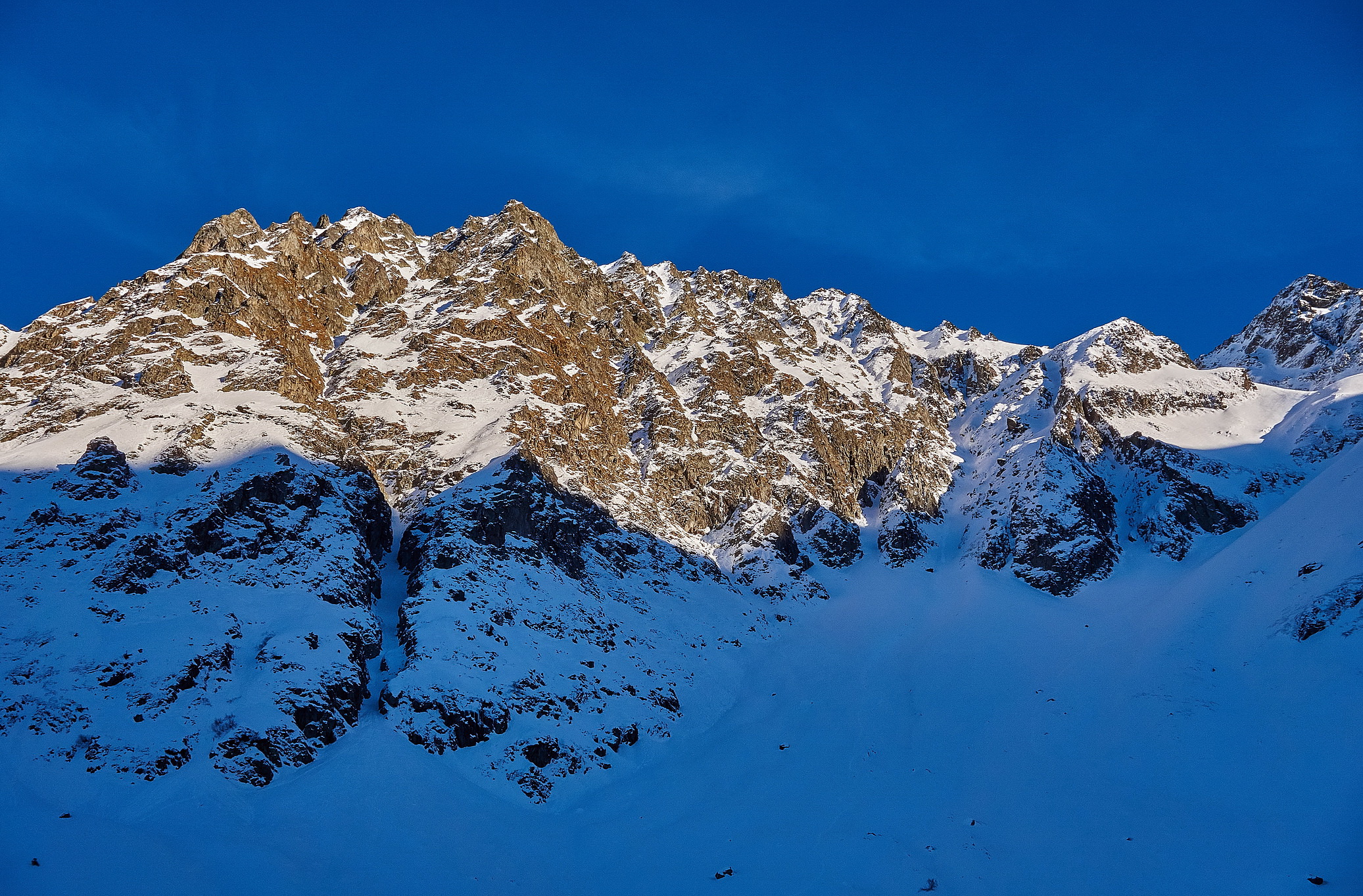 - En redescendant versant Veyton : soit revenir au collu de sortie du couloir SW et descendre versant Veyton par un couloir N (40°), soit, du sommet, descendre SE sur 50 m une pente raide et par un court passage étroit puis rejoindre les vastes pentes qui dominent le vallon du Veyton.
