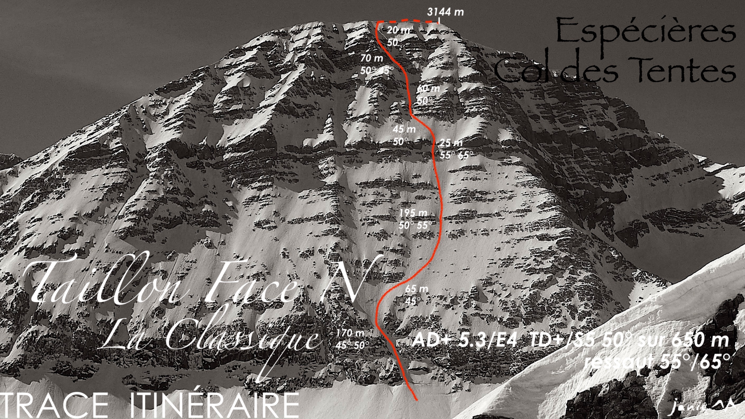 Du triangle susmentionné, effectuer une traversée ascendante à droite de 65 m 45° qui mène dans l'axe de la face que l'on remonte sur 195 m pente régulière à 50° qui se redresse 55° en approche de la barre rocheuse ou ressaut 25 m à 55°/65°, au sortir de celui-ci se diriger par une traversée ascendante 45 m de droite à gauche vers le couloir pente 50°, le couloir dans l'axe 60 m à 50° qui donne accès à la rampe déclive de droite à gauche 70 m d'abord 50° puis 45°. De là, la rampe de sortie 20 m 50° dans l'axe de la voie, puis le sommet à l'W en suivant la crête sur 80 m.